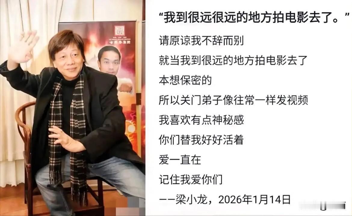 大家可能误会梁小龙的关门弟子了。从梁小龙最后的发文可以看出,第一,他的“不辞而别”是保密的,所以关门弟子像往常一样发视频出来。香港媒体曝光了这件事情后,大家才知道他走了。所以,弟子们可能也不知道师父已经不在了。如果知道师父走了,不可能还继续发布视频,从而招人指责。 第二,梁小龙走的虽然突然,但很祥和。没有给人一种生死离别的感觉,他用很轻松的姿态告诉大家,他把这件事情看的很淡然。