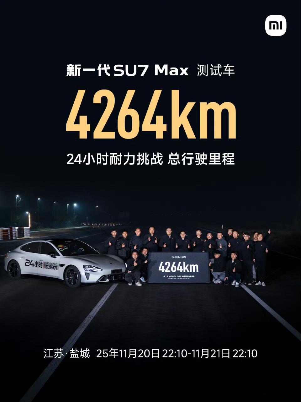 新一代小米SU7 MAX测试车24小时耐力挑战成绩出炉——4264km!不仅刷新之前小鹏P7保持的3961公里纯电车耐力纪录,同样超过了去年小米YU7创下3944公里的成绩。小米新SU7刷新24小时耐力挑战纪录