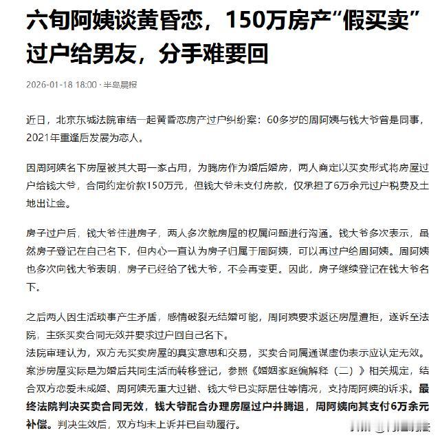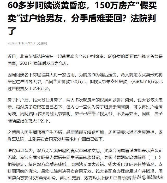 北京,六旬老人周阿姨和钱大爷曾是同事,钱大爷离职后近二十年,两人就没了联系。如今两人重逢,都是单身,就打算领证结婚。周阿姨想拿回被大哥占的房子当婚房,与钱大爷商量后以150万买卖的形式过户,钱大爷没有付房款,只承担了6万余元的税费。后来两人的感情破裂了,周阿姨想要回房子被钱大爷拒绝,起诉后,最终法院确认合同无效。 半岛晨报、光明网、红星新闻于2026年1月18日报道了这则新闻。 据报道,周阿姨和钱大爷年轻时同事一场,2002年钱大爷离职后,近二十年两人都没再联系过。 2021年,年过六旬的两人竟偶遇又重逢。 这一碰面,才知道彼此都单身,或许是孤独作祟,又或许是晚年想有个伴,两人很快谈起了恋爱,还打算领证结婚。 周阿姨心里一直惦记着一件事,她有一套房子,一直被大哥占着。她想要是能把房子要回来,就能当作和钱大爷的婚房。 可大哥一直不肯归还,周阿姨没了主意,便和钱大爷合计后,想出了个办法,以买卖的形式把房子过户给钱大爷。 2021年10月,两人签了合同,房子标价150万。 周阿姨心里清楚,这只是个形式,钱大爷根本不会真的付这150万。 钱大爷也心领神会,爽快地答应了。 不过,过户可不是免费的,得交6万多元的土地出让金及过户税费,钱大爷也自愿承担了这笔费用。 周阿姨以为房子过户后,大哥没了理由,自然就会把房子腾出来。到时候,她和钱大爷就能住进去了。可她没想到,这个计划却埋下了隐患。 刚开始,两人的感情还挺好,可时间一长,生活中的琐碎小事逐渐消磨着他们的感情。 两人开始因为一些小事争吵,矛盾越来越多,关系也越来越紧张。 2023年3月,周阿姨觉得这样的日子实在过不下去了,她不想再和钱大爷继续下去,便提出要回房子。 周阿姨觉得这房子本来就是自己的,只是暂时过户给了钱大爷,现在感情没了,房子自然得还回来。 可钱大爷却指出,房子已经过户到自己名下,那就是自己的了。而且,自己还承担了过户的所有费用,现在周阿姨说要就要,哪有这么容易的事。 周阿姨多次催促钱大爷把房子过回自己,可钱大爷就是不为所动。没想到钱大爷会如此绝情,她决定起诉钱大爷,希望用法律尽快要回自己的房子。 周阿姨强调当初过户房子只是为了拿回房子当婚房,并不是真的卖给了钱大爷,150万的交易是假的。 钱大爷理直气壮地拿出了合同,称合同是双方自愿签订的,具有法律效力。自己虽然没有付150万房款,但承担了过户税费,房子就应该归自己所有。 审理时,根据双方提供的证据,包括聊天记录等。从这些证据中可以看出,两人签订买卖合同并没有真实的买卖意思,150万的交易只是幌子,这份合同属于虚假合同。 根据法律规定,虚假合同是无效的。而且,从聊天记录等证据还能看出,两人过户房子一方面是为了让大哥腾房,另一方面是想把房子当作婚后共同财产。但口头承诺并不能确定房屋的归属。 最终,法院判决确认这份买卖合同无效。考虑到钱大爷承担了6万多元的税费,周阿姨需将这笔费用返还给钱大爷。钱大爷要配合周阿姨将房子过户回她名下,并腾出房子。 周阿姨和钱大爷签的房屋买卖合同被法院认定无效,这是为什么呢? 根据《民法典》第一百四十六条规定,行为人与相对人以虚假的意思表示实施的民事法律行为无效。以虚假的意思表示隐藏的民事法律行为的效力,依照有关法律规定处理。 周阿姨和钱大爷虽然签订了标价150万的房屋买卖合同,但钱大爷实际上并未支付房款,这表明双方并没有真实的房屋买卖意思。 从聊天记录等证据也能看出,他们过户房子的目的,一是想让周阿姨大哥腾房,二是打算作为婚后共同财产,所以这150万的交易是虚假的,该合同属于“虚假合同”,依法应当无效。 合同无效后,就会涉及到后续的处理问题。 依据《民法典》第一百五十七条规定,民事法律行为无效、被撤销或者确定不发生效力后,行为人因该行为取得的财产,应当予以返还;不能返还或者没有必要返还的,应当折价补偿。有过错的一方应当赔偿对方由此所受到的损失;各方都有过错的,应当各自承担相应的责任。法律另有规定的,依照其规定。 钱大爷因为虚假合同取得了房屋,现在合同无效,他就应当配合将房屋过户回给周阿姨并腾房。而钱大爷承担的6万多元土地出让金及过户税费,是基于这个无效合同产生的损失,由于双方对于签订虚假合同都有一定过错,所以法院判决周阿姨承担这6万多元税费并返还给钱大爷。 从法律层面看,这份判决是合理合法的。虚假合同违背了诚实信用原则,法律明确规定其无效。 法院在判决时,没有仅仅依据表面的合同,而是深入探究了合同背后的真实关系,依据相关法律条文做出了公正的裁决。 对此,大家都怎么看呢?是觉得周阿姨当初就不该用这种方式拿回房子,还是认为钱大爷太过自私,不该霸占房子不放?