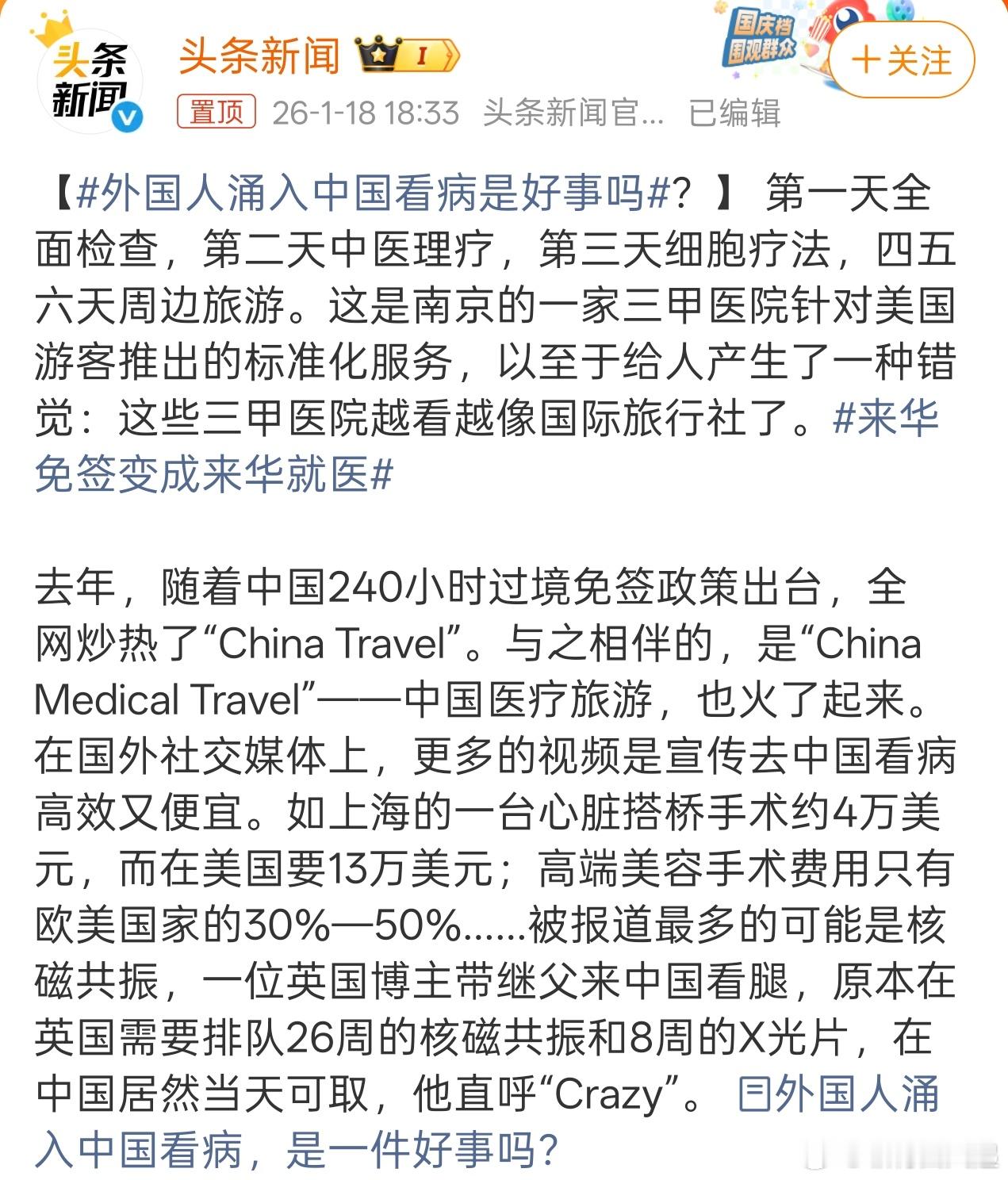 外国人涌入中国看病是好事吗只要不使用国家的医疗补贴,不抢占普通民众紧俏的医疗资源,还是可以支持医疗机构以此创收的,尤其是冷门的一些科室