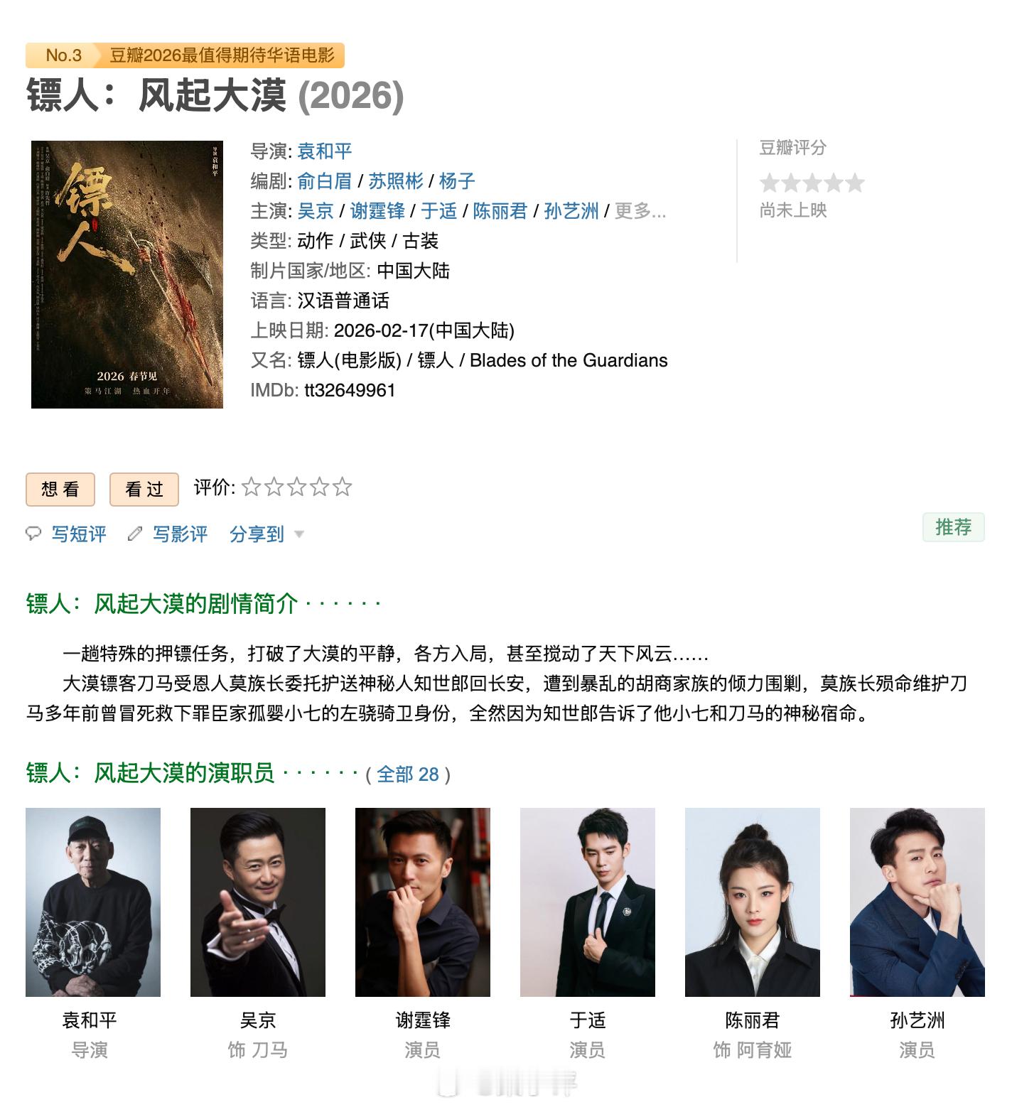 电影镖人定档春节《镖人:风起大漠》演员表:吴京,谢霆锋,于适,孙艺洲,梁家辉,张译,李连杰,于荣光.....这阵容,大家感受下: