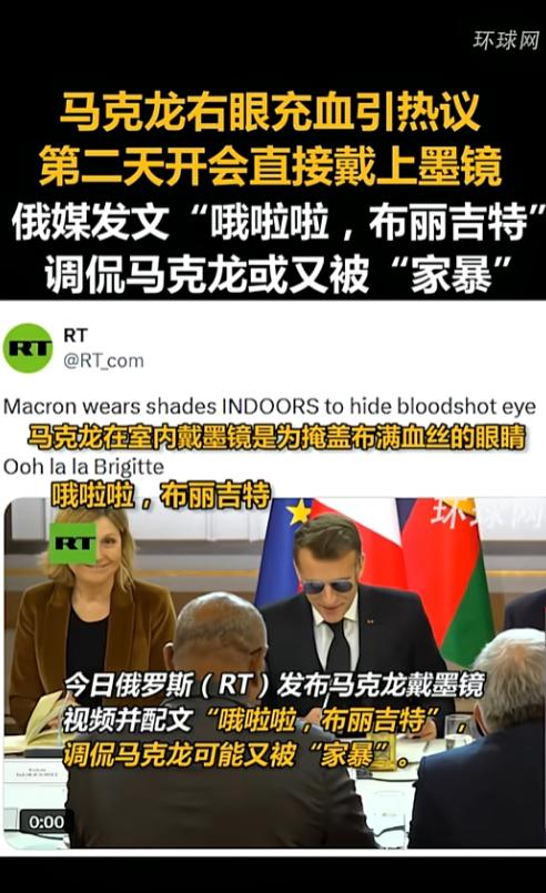 法国总统马克龙最近算是靠一只眼睛,把全网的笑点都承包了,前几天他在给法军做新年致辞时右眼红得发亮,血丝密布的样子被镜头逮了个正着,画面刚一流出网友们就开启了福尔摩斯模式。 这下爱丽舍宫赶紧出来解释,说就是眼内一根小血管破裂,属于良性出血,不用治疗。 而马克龙本人还挺乐观,半开玩笑地说这是《洛奇3》里的 “虎眼”,寓意自己像拳击手一样越挫越勇。 结果到了1月16日的爱丽舍宫会议上,马克龙直接戴了一副蓝色墨镜亮相,把发红的右眼遮得严严实实,活像要去参加红毯走秀。 这欲盖弥彰的操作,反而让大家的好奇心直接拉满:“不是说没事吗?为啥要遮遮掩掩?” 就在全网猜测之际,俄媒直接放出“王炸”,发文配了一句“哦啦啦,布丽吉特”,明摆着调侃马克龙“又被老婆家暴了”。 这个梗其实是去年5月的“老存货”,当时马克龙夫妇在越南专机上,布丽吉特抬手碰他脸的动作,被俄媒解读为“掌掴”,“家暴”的玩笑就传过一轮。 如今眼睛一红、墨镜一戴,俄媒直接把旧梗翻炒,网友们笑到打鸣:“俄媒是懂流量的,这波玩梗我给满分!” 说到底,这本来就是个普通的健康小意外,但架不住“总统身份+夫妻年龄差+国际舆论互怼”,这几个流量密码叠在一起。 只能说,当公众人物太难了:不仅要治理国家,还要随时准备好应对全网的 显微镜式围观”,连眼睛里的一根血丝,都能变成全球网友的快乐源泉。