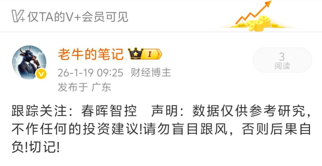 【2026年1月19日更新!】记录老牛个人投资笔记!并非推荐,请勿盲目跟风! 今日参与:春晖智控!点赞是美意,赞赏是鼓励!特别声明:这只是老牛个人的操作笔记,不作任何投资建议, 请勿盲目跟风!否则后果自负!股市有风险,投资需谨慎!切记!