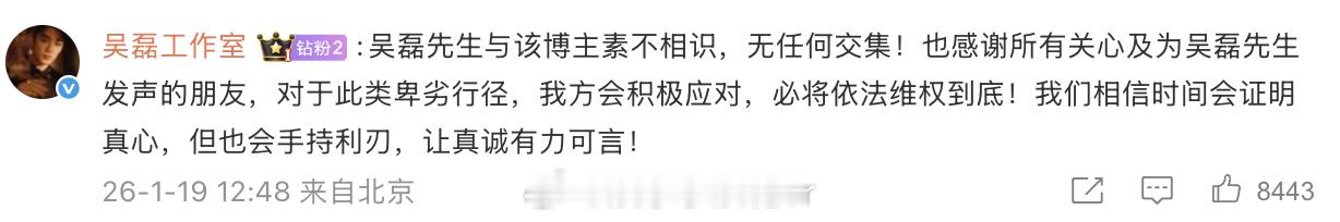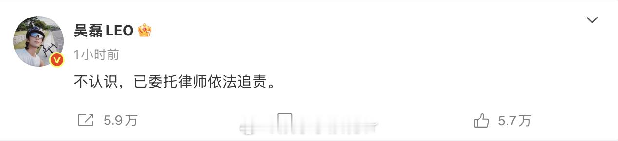 吴磊 不认识吴磊方依法追责造谣者 针对昨日白珊珊喊话“吴磊你欠我的拿什么还”,发文回应称:“不认识,已委托律师依法追责。”随后转发并评论:“吴磊先生与该博主素不相识,无任何交集!”并表示将依法维权到底。