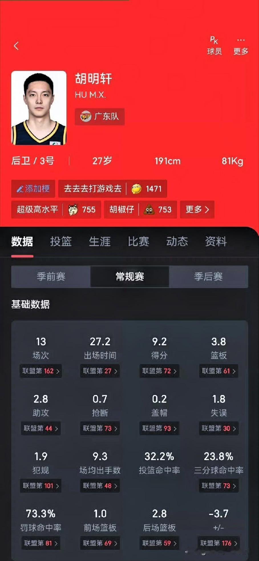 恕我眼拙!广东全运男篮球员垄断cba全明星首发,南北人数10人占据7人,仅有胡金秋、曾凡博和齐麟来自其他代表队,场均9.2分的胡明轩再回全明星首发,命中率32%,三分23%,不得不感概一句:这是广东全运男篮全明星赛,有几个球员入选让我感到看不懂,比如说沈梓捷新赛季一共打几场球,再比如徐昕能力压周琦,胡明轩这一周追分超猛直接反超庞峥麟。