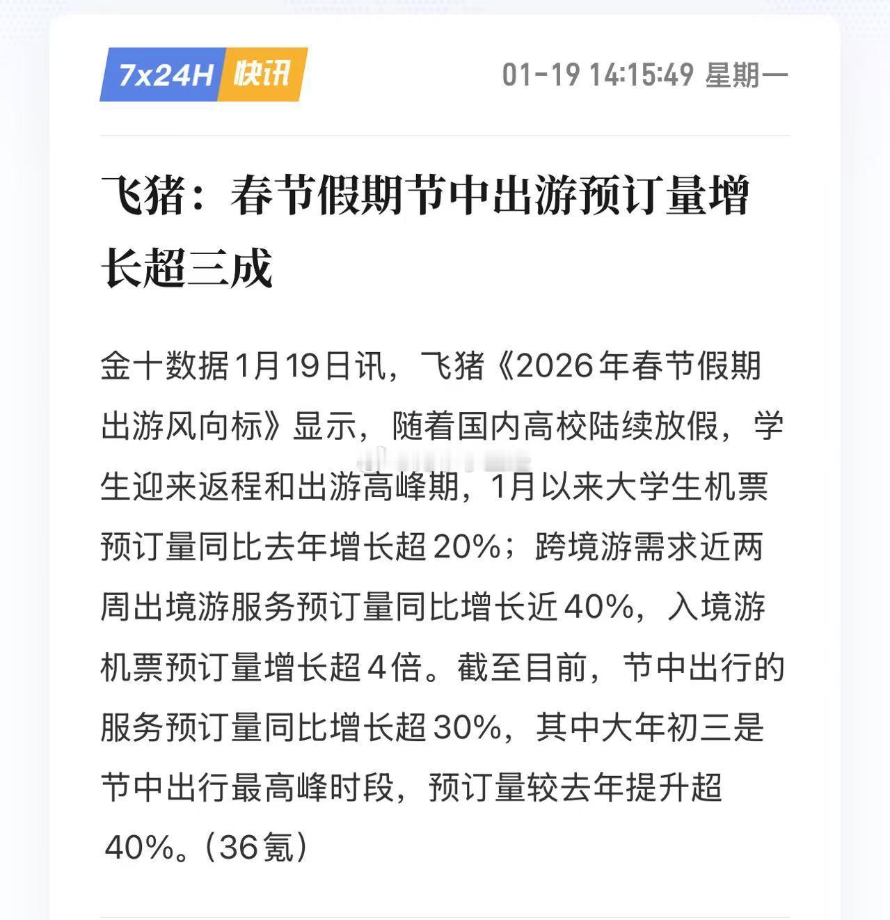 飞猪:春节假期节中出游预订量增长超三成今天旅游板块大涨,2026年春节假期长达9天,成为“史上最长春节假期”,迅速点燃旅游市场,各大平台春节出行搜索量瞬时翻倍增长
