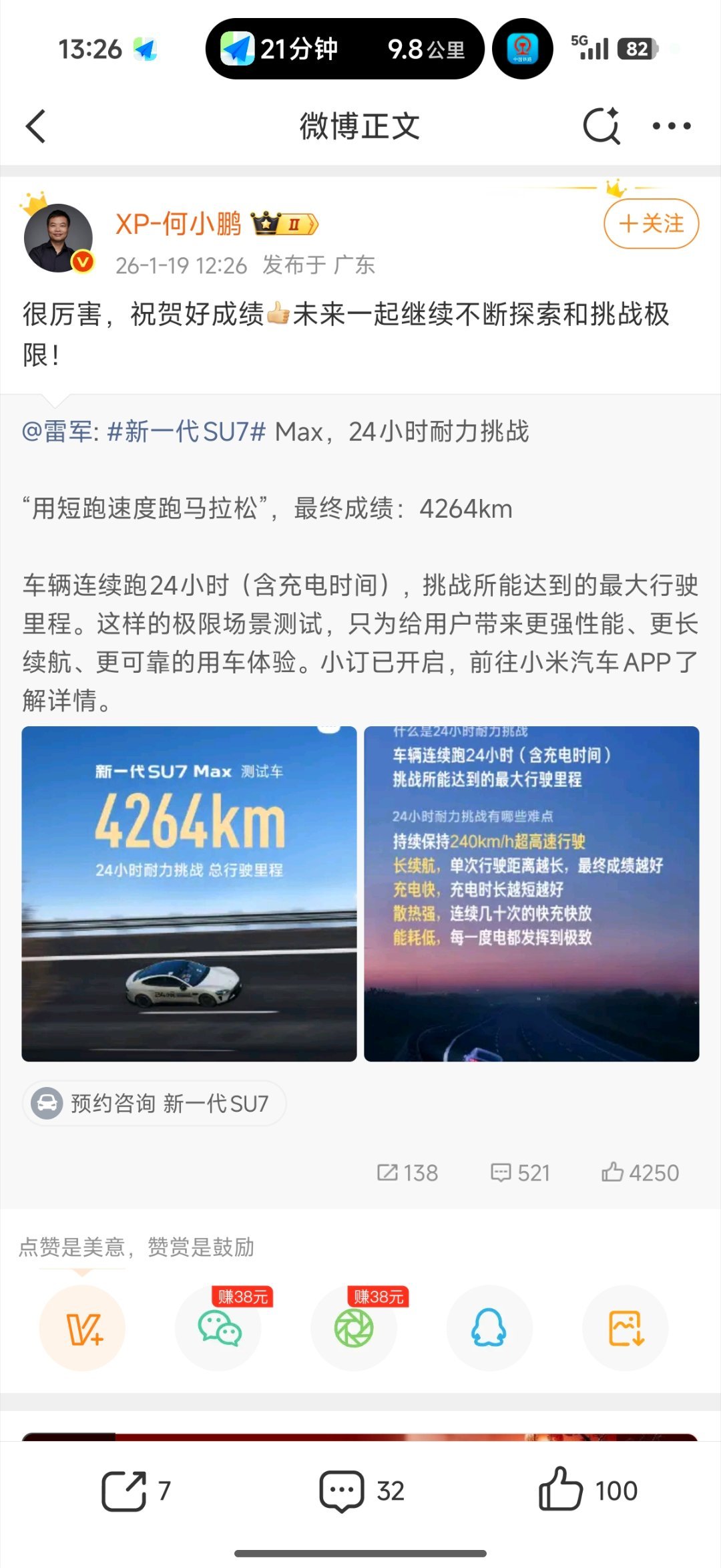 小鹏汽车董事长何小鹏在微博转发雷军动态并点赞:SU7Max 24小时极限续航4264 km,刷新电车耐力纪录!雷军称,这场“用短跑速度跑马拉松”的挑战,车辆含补能连续行驶整整一天,最终把行驶里程推至4264公里。何小鹏留言“很厉害,祝贺好成绩”,并邀约未来一起继续探索技术边界。