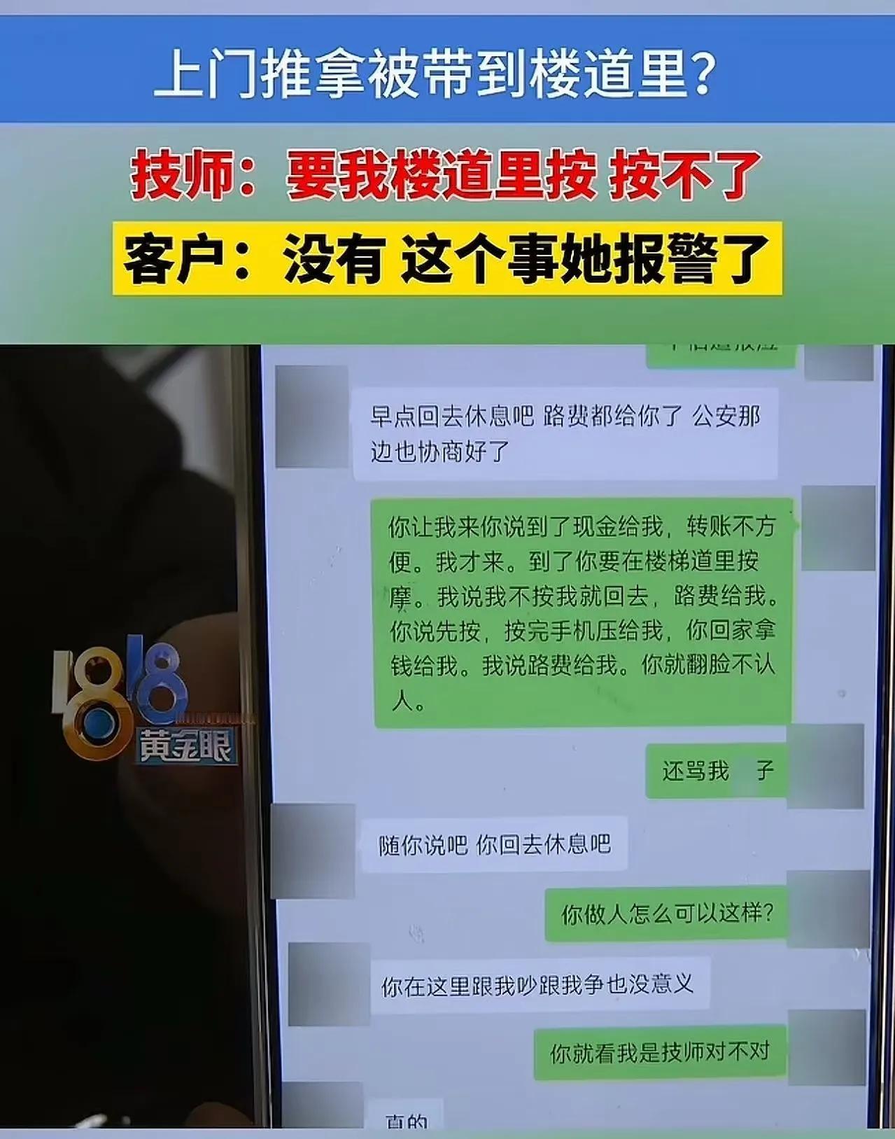 凌晨,按摩女上门推拿,被客户带到楼道里?按摩女:“他说老婆在家里不方便,让我在楼道里按,我说按不了,让他给我路费,他不给我路费。”客户:“不是她说什么就是什么,我觉得她是不正规的按摩,就不想按了!” 这事得从零点刚过说起。徐女士做上门按摩三年,凭着力气和手艺挣口饭吃,从不敢越雷池半步。 那天夜里,一个陌生男人加她微信,说家里需要推拿,语气急火火的。 徐女士按规矩要先收路费,对方却说怕老婆查账,见面给现金,还催着她赶紧动身。 “都是讨生活的,谁还没点难处?”她这么想着,揣着仅有的五十块零钱当车费,骑着电动车往那小区赶。 凌晨零点四十二分,小区路灯昏黄,她按着定位找到单元楼,男人早已在楼下等着。 没等她开口要路费,男人拽着她就往楼梯间走,声音压得像偷东西:“老婆在家,楼道里对付按按。” 徐女士当时就愣在原地。楼道里连个坐的地方都没有,四面漏风,寒气顺着裤脚往上钻。 “这地方怎么按?连块垫子都铺不开,冻得人骨头疼!”她皱着眉拒绝。 男人脸色立马沉了下来:“不想按就滚,我看你也不是什么正规按摩的。” 徐女士气不打一处来,大半夜跑这么远,路费总得给吧?可男人扭头就走,骂骂咧咧的。 她掏出手机想录个证据,那男人见状,撒腿就往电梯口跑,到了跟前还挥着拳头吓唬人。 徐女士本能地往后躲,腰眼猛地撞到楼梯扶手,疼得她直咧嘴。 她咬着牙报了警,民警赶来时,男人倒打一耙,说徐女士狮子大开口。 第一次调解,民警劝她息事宁人,她删了视频,男人甩给她四十块钱,像是打发乞丐。 原以为这事就这么了了,可第二天起床,徐女士的腰疼得直不起来,去医院检查,又是拍片子又是拿药,花了四百多。 她找那男人要医药费,对方直接拉黑了微信,电话也不接。 没法子,她只能找调解员帮忙。面对镜头,男人依旧振振有词:“她穿得少,大半夜上门,能是正经生意?我不按是对的。” 徐女士当着众人的面打开工具箱,针灸针、按摩膏、热敷包摆了一地,都是正规厂家生产的。 “我凭双手挣钱,一不偷二不抢,怎么就不正经了?”她的声音不高,却透着一股子韧劲。 记者去派出所核实,民警说初次调解后,因徐女士伤情出现,已经正式立案调查。 这事传到网上,评论区吵翻了天。有人说:“大半夜一个女人上门,难免让人多想。” 这话听着就刺耳。男人上门维修、代驾,怎么没人说“不正经”?换成女人做服务,就活该被贴标签? 还有人看得明白:“老婆在家不方便就是借口,真要按摩,不会约白天,不会去店里?” 说白了,那男人就是想占便宜,没得逞就想赖账,还想倒打一耙,把脏水泼到徐女士身上。 徐女士的遭遇,不是个例。多少女性从事服务行业,总要承受莫名的偏见和揣测。 她们靠手艺谋生,凭劳动挣钱,不比谁低贱。那些动辄用“不正经”贴标签的人,骨子里是对劳动者的轻贱。 法律面前,职业没有高低,劳动都该被尊重。徐女士的腰伤在疼,可某些人的良心,怕是早就麻木了。 民警已经立案,公道总会来的。但更该醒醒的,是那些带着偏见看人的眼睛,是那些不把劳动者当回事的凉薄心肠。 深夜里靠双手谋生的人,值得一份体面,更值得一份尊重。别让寒风吹凉了讨生活的勇气,也别让偏见玷污了劳动的尊严。