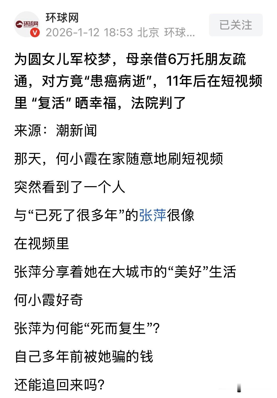 陕西宝鸡,女子一心想让女儿考进军校,一好友得知后,说自己有关系,可以帮女子疏通,交6万孩子就能考进去,女子信以为真,管亲戚借了6万交给好友,谁料1年过去,事情还没着落,女儿也因此耽误了上学,面对女子的催促,好友声称自己患上癌症,时日不多了,接着就消失了10年,女子以为好友已经病逝,她认栽了,结果事情竟迎来反转。 何小霞农民出身,没正式工作,全靠给人打零工撑着,深知没文化没门路的苦。 所以,她把所有希望都寄托在了闺女身上,发誓不能让孩子再走自己的老路。 也就是在建材城做生意期间,何小霞认识了张萍。 这张萍看着是个开门店的老板娘,看着挺风光,实际上那是驴粪蛋子表面光。 她生意赔了个底掉,外面欠了一屁股债,正愁没处弄钱填窟窿呢。 两人熟了以后,张萍盯上了何小霞的一块心病。 她闺女高中毕业,想上军校但没门路。张萍眼珠子一转,恶向胆边生,一个馊主意就冒出来了。 张萍张嘴就是吹牛,说妹子,你这事儿包我身上!我认识里面的大领导,我帮你梳通,不用考试,交钱就能进! 何小霞一听,眼睛都亮了。为了女儿的前途,她哪怕条件不好,也得把这钱交上。 2012年1月,她东拼西凑借了4万块给张萍。谁料,张萍拿到钱,表面上说已经打点过去了,实际转手就还了自己的债。 可这点钱不够啊,到了5月,她又编了个理由,说打点关系还得加码。 何小霞又借了2万转过去。 钱给了,何小霞以为稳了。可接下来的一年,她每次问进度,张萍要么不回,要么就说快了快了。 更坑的是,张萍为了演得真一点,竟让何小霞闺女别考虑别的学校了,就等着入学军校就行。 这一等,就是1年,直接把孩子的其他上学机会全给耽误了。 何小霞愁得不行,那6万块全是她借来的,钱掏出去了,事儿却没办成,她就联系张萍,让把钱还给她。 然而,此时的张萍突然说自己患上癌症,命不久矣,总之就是拿各种理由搪塞何小霞,不肯还钱,后来干脆把她拉黑了。 不过,张萍生病这事倒还真不是她瞎扯,她真的患上了癌症,后一直在北京治疗。 后来,这病还真让她治好了,但她心里有鬼,不敢用真名,不敢住好房子,只能猫在阴暗潮湿的地下室里,平常在小作坊里打工度日。 这一躲,就是10多年。 这么多年过去,何小霞以为张萍已经离世了,当初那6万,她自己认了。 可这人啊,一旦安逸了就容易飘。2023年,张萍觉得风头过去了,何小霞肯定早就把这事儿忘了。 于是,她大着胆子开了个短视频账号,天天发自己在大城市吃好喝好的视频,装得人模狗样的。 殊不知,何小霞在老家刷手机,刚好就刷到了她。 何小霞一眼就觉得这视频里的人眼熟,说这不就是那个骗子张萍吗?不是说得癌症快死了吗?怎么还活蹦乱跳的? 何小霞留了个心眼,连着看了好几天,越看越觉得像,除了胖点,那神态动作一模一样。 她试着发私信,对方根本不理。何小霞这下确定了:这人一直在骗我! 2023年6月1号,何小霞去派出所报了案。 这案子一开始还有点麻烦,毕竟过了11年了,还能追诉吗? 检察院介入后,说必须查,这不仅是钱的事,是把人家孩子一辈子都毁了。 检察官那是真下功夫,把张萍的银行流水、出行记录查了个底朝天。 张萍还在那嘴硬,说我真认识那个叫高强的领导,我还给了他3万呢! 检察官把户籍系统的查询结果拍在桌上,说全国叫这名的都没一个符合你描述的,你还编? 铁证如山,张萍终于怂了,不仅承认诈骗,还签了认罪认罚书。 《刑法》第266条规定:诈骗公私财物,数额较大的,处三年以下有期徒刑、拘役或者管制,并处或者单处罚金。 法律规定诈骗罪的本质是“骗”。张萍并没有真的认识什么部队领导,这叫虚构事实、隐瞒真相。 她利用何小霞没文化、想让女儿有出息的心理,编造了一个只要花钱就能上军校的谎言。 何小霞因为信了这个谎言,才自愿把钱交出去。所以,张萍的行为完美契合了用欺骗方法骗取数额较大财物的犯罪构成。 虽然在很多经济发达地区,6万元可能刚够上“数额较大”的标准,但在本案中,这6万元的危害性远超金钱本身。 法律在量刑时不仅看钱数,还要看情节。 张萍的诈骗导致何小霞的女儿错失了其他上学机会,一辈子的命运被改写。 这种造成被害人家庭严重后果、导致被害人生活陷入困境的情况,属于其他严重情节的考量范围。 根据《刑事诉讼法》的相关规定,对于自愿如实供述罪行、承认指控犯罪事实、愿意接受处罚的,可以依法从宽处理。 2024年12月,法院判了:张萍犯诈骗罪,判刑1年10个月,罚款1万5。 法院最终判她1年10个月,而不是顶格的3年,就是考虑了她认罪认罚,以及退了5000元的情节。 对此,你怎么看? 欢迎关注@一案一论