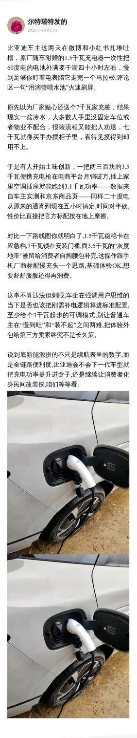 比亚迪随车那只1.5千瓦的充电枪,就是被“万一出事谁负责”这根高压线给逼出来的。 你们都以为厂家抠门,舍不得那几百块的3千瓦充电枪成本对吧? 错!大错特错! 厂家怕的不是花钱,是怕事。 我给你算笔账。家庭普通插座,安全上限就2.2千瓦。送你1.5千瓦的枪,就算你家用的是三十年前的铝线,它也勉强能扛。 留出的那点余量,不是留给电的,是留给人性的。 总有人会用插线板再接出八丈远,总有人觉得“充一次没事”。 但真要送你3千瓦的枪,这事性质就变了。 我有个开秦PLUS的同事就不信邪,自己买了个3.5千瓦的枪。结果呢? 在租的老公寓里充了不到俩小时,插座面板直接能煎鸡蛋了。第二天物业就找上门,说整层楼的线路警报都响了。 就这,他还嘴硬,说“第三方枪便宜又好用”。 是,枪是便宜。 可万一哪天真着火了,烧的可是比亚迪的招牌。新闻标题我都替他们想好了:《比亚迪充电再酿惨剧,家用插座安全堪忧》。 到那时候,谁还管你是不是原装枪?谁还细究你家线路老不老?口水就能把销量淹死半截。 所以,总有“理中客”会说,这是厂家推卸责任,该教育用户。 教育?说得轻巧。全国上千万车主,你教育得过来吗? 最好的教育,就是把选择权给你,但把责任的坑挖得清清楚楚。原装1.5千瓦枪,就是那条坑线。在线内,我保你。踩出去,生死自负。 这只慢得让人心慌的充电枪,根本不是技术落后的产物。 它是这个时代,最精明也最无奈的商业免责声明。厂家早就用最低的成本,完成了最彻底的风险切割。