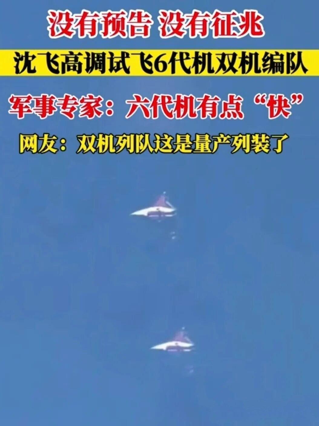 沈飞高调试飞6代机双机编队,网友:双机列队这是量产列装了! 有一说一,试飞员是刀尖上的舞者,在云端之上与极限博弈; 也是和平年代的隐形盾牌,用一次次试飞为祖国筑牢空天防线。 六代机在试飞,估计七代机都已经在研发了,看来南天门计划快要实现了。