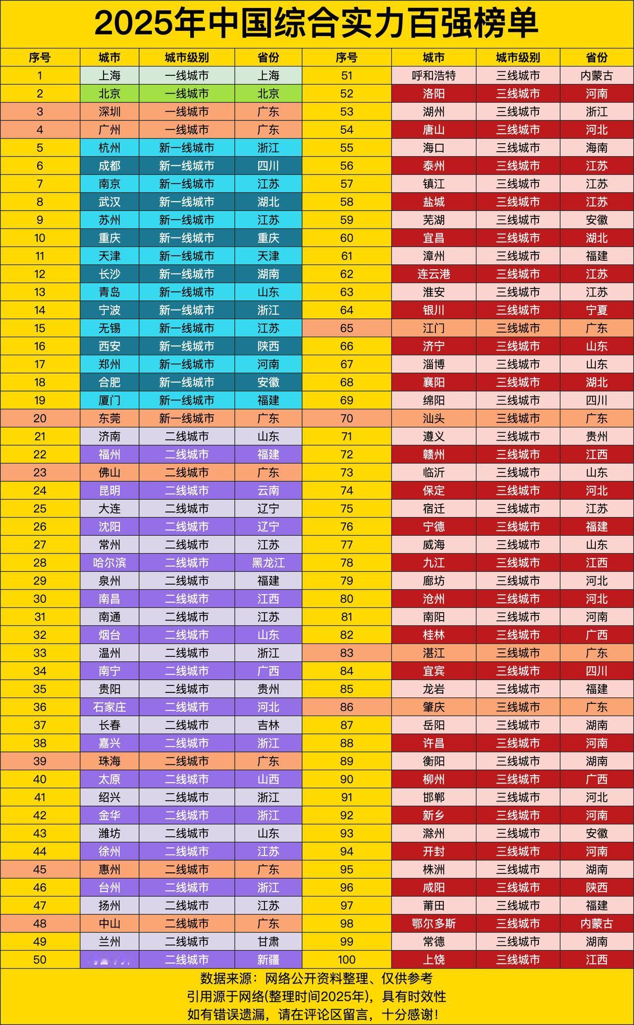 一线城市还是那老几位“大佬”,上海、北京、深圳、广州稳坐钓鱼台。就像班级里的学霸,成绩常年名列前茅,想超越可不容易。它们在各方面都是标杆,吸引着全国的人才和资源,简直是城市界的“顶流”,让人不得不服。 再看新一线城市,这可是个“潜力股”大集合。杭州、成都、南京这些城市,近几年发展势头那叫一个猛。就好比班里进步飞速的同学,不断缩小和学霸的差距。它们靠自身的魅力和政策优势,吸引企业入驻,提升城市活力,在综合实力的赛道上一路狂奔,未来可期哟。 榜单里还有众多二三线城市呢。二线城市像是班级里中等偏上的学生,有自己擅长的科目,也在努力提升成绩。而三线城市就比较多样啦,有的像努力追赶的同学,有的还在找自己的方向。不过每个城市都有自己的潜力,说不定哪天就逆袭了,给咱们一个大惊喜呢。 总的来说,这份榜单就是城市的一场“大考”成绩单。不管排名如何,每个城市都在为自己的发展拼搏。希望它们都能越来越好,咱老百姓的生活也能跟着“水涨船高”,一起期待城市们更精彩的表现吧!