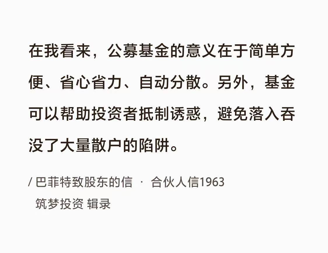 巴菲特曰:“在我看来,公募基金的意义在于简单方便、省心省力、自动分散。另外,基金可以帮助投资者抵制诱惑,避免落入吞没了大量散户的陷阱。”