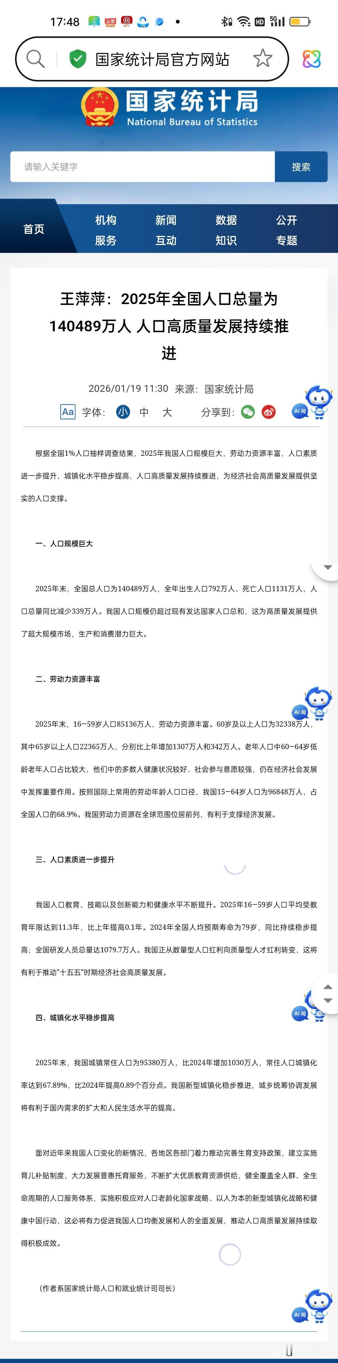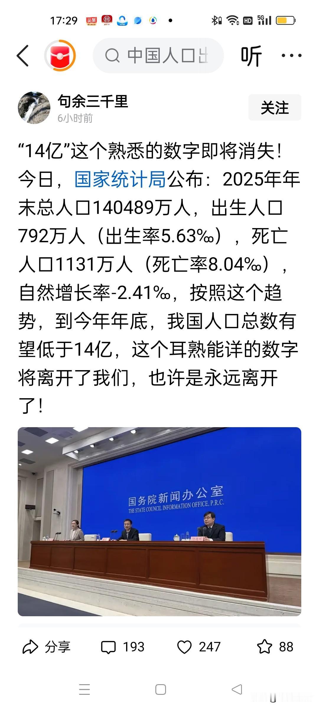 果然2025年人口生育还是跌破了800万 今天上午国家统计局公布了2025年全国人口情况,全国总人口140489万人,2025年出生人口792万,而死亡人口1131万人,很显然进入了人口负增长时代。按照这个结构,2026年年底全国总人口会低于14亿大关! 2025年全国60岁以上人口3.2338亿人,老龄化率23%。城镇人口9.5380亿,城镇化率67.89%。 几个关键词“少子,老龄化,高城镇化”,人口结构意变化味着消费结构变化,越来越多的学校关闭会不会变成养老机构?越来越多的房子是不是就卖不出去了? 但也有专家出来说,随着国家生育政策发力,人口出生率一定反弹。 我个人认为也许会有那么一天,但需要一个漫长的时间,至少30年以内不可能实现反弹,2014年和2016年是人口出生高峰,意味着2032年到2036年之间上学和就业竞争将是空前的,生存压力也是空前的,机器人和人工智能会让很多人失业不得不躺平。 城乡差距也会越来越大,农村空心化会更严重,小城市更加边缘化,大城市的虹吸效应会更强“强者恒强”。因为人口更多的地方才能产生更多工作岗位和就业机会,也就更卷! 随着人口向核心城市集聚,许多中小城市和县城面临“空心化”危机。街道上的年轻人越来越少,商场、餐馆的客流量下降,部分商铺倒闭;房地产市场结构性过剩,新建楼盘无人问津,已售房产难以变现,房贷压力成为许多家庭的沉重负担。公共服务也面临挑战,医院优质医生流失,学校生源不足,教育质量下滑,陷入“人口流失→资源减少→更多人离开”的恶性循环。但对留下来的人而言,生活节奏缓慢,房价低廉,竞争压力小,若能抓住特色产业发展机遇,也能获得安稳的生活。