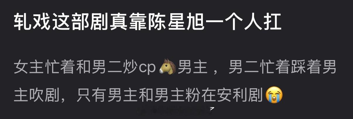 有网友说轧戏这部剧是靠陈星旭一个人扛,女主忙着和男二炒cp🐴男主 ,男二忙着踩着男主吹剧,只有男主和男主粉在安利剧,大家怎么看?