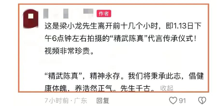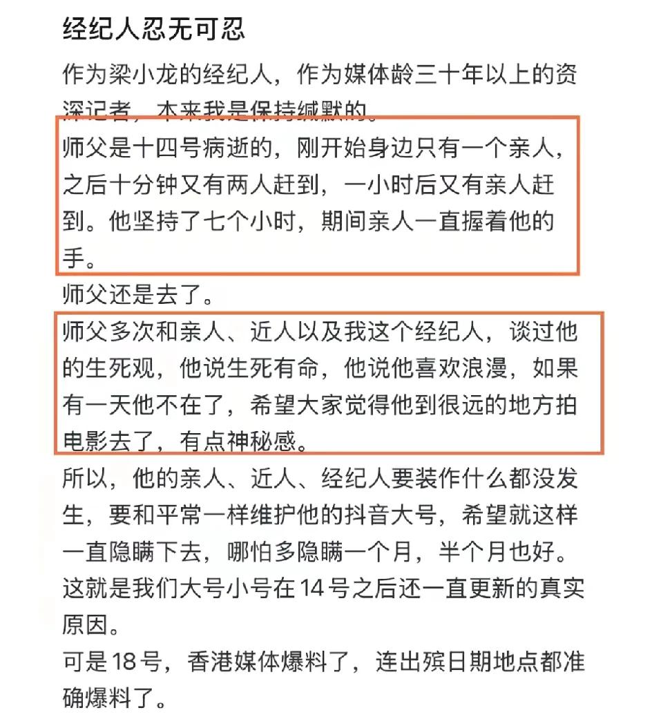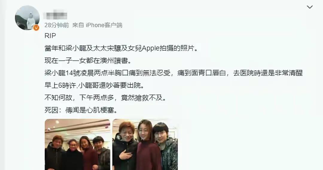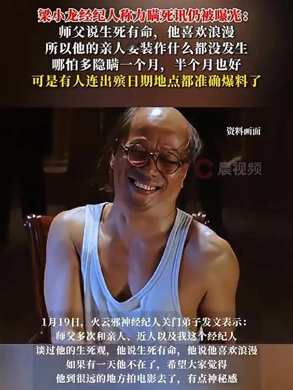 梁小龙头天仍赚钱养家,第二天凌晨两点半胸口痛,下午抢救不及时。坚持了七个小时,儿女在澳洲。隐瞒死讯是他本人意愿。 永远的陈真李小龙先生溘然离世。他的抖音更新到了18号。1月13日下午6点多他在拍摄“精武陈真”代言仪式。现场还耍了一套拳。1月14日凌晨2点多钟,他感到胸口疼痛,面青口白,去了医院。到早晨的时候他要回去,他觉得自己没什么大碍。下午2点多钟的时候抢救已经来不及了,他坚持了7个多小时,等着亲人的到来,他儿子,女儿都在澳洲。 为什么14号离世,18号还在更新视频呢?这是他本人的意愿,他本身就是一个非常浪漫低调的人。他说有一天他要离去了,大家就当他是去很远的地方拍电影了,不需要大张旗鼓,他想默默的静静的离开,就像从来没有离开一样。