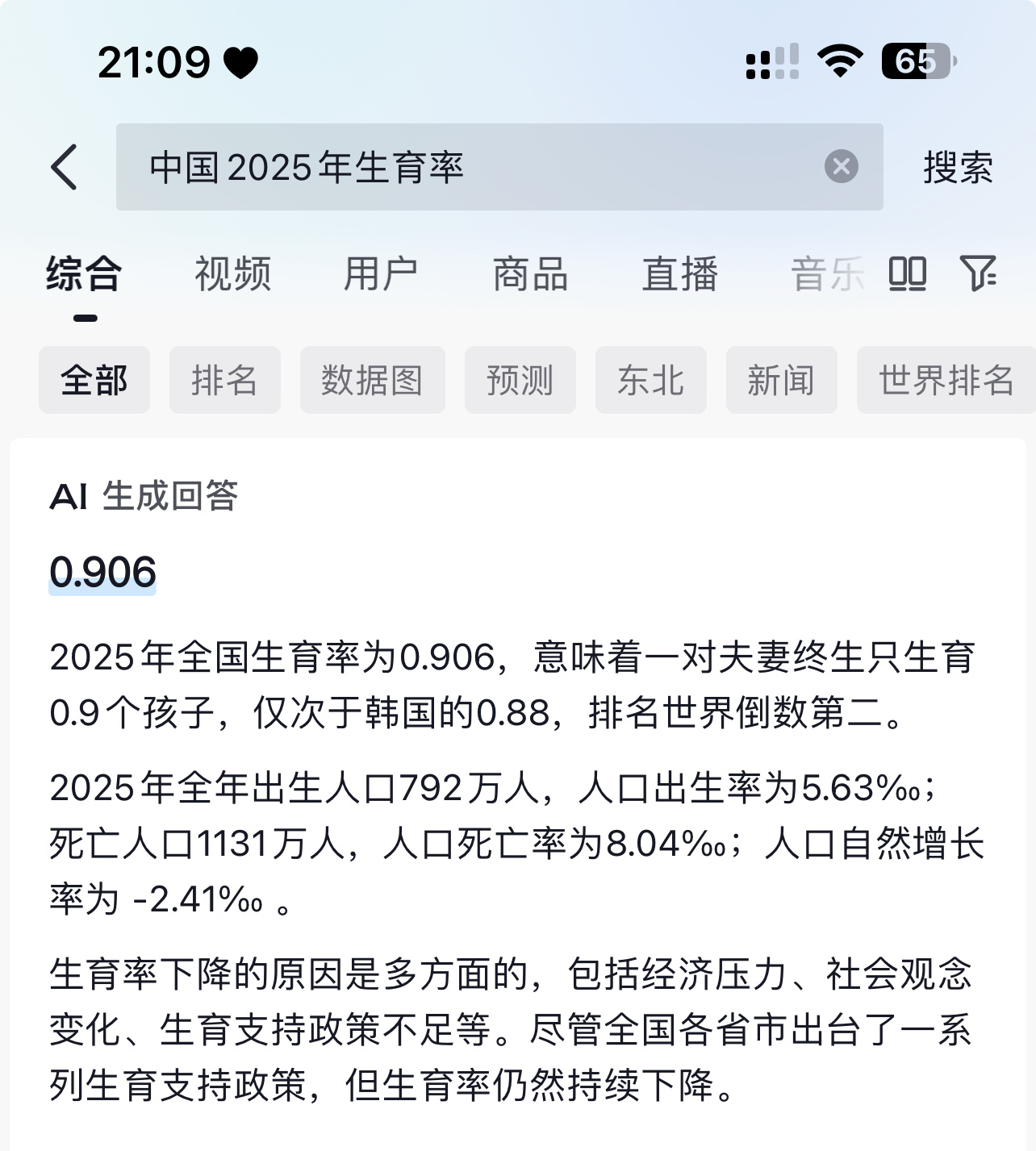2025年全国生育率为0.906,意味着一对夫妻终生只生育0.9个孩子,仅次于韩国的0.88,排名世界倒数第二。