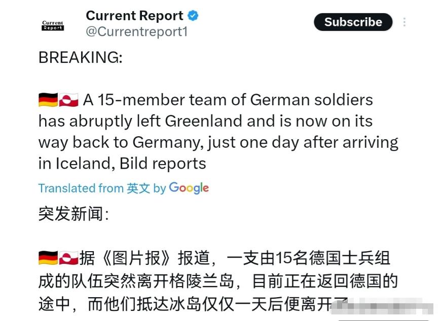 德国撤兵了,面对特朗普的压力,德国一天都没有坚持住!特朗普刚宣布要对欧洲八国加关税,不到24小时,德国就宣布撤军了!1月18日,根据德国图片报报道,一支由15名士兵组成的德国小分队在抵达冰岛仅一天后,便突然宣布撤离格陵兰岛,目前正启程返回德国。 说白了,特朗普这招,太狠了!这不是正常施压,这是恃强凌弱! 说实话,这可能是德国为了避免与美国产生更大冲突,不想让本国经济遭受美国关税大棒的打击,但这种在压力下迅速妥协的做法,是典型的政治软弱。如此轻易放弃立场,只会让自身在国际事务中的话语权被削弱。 要清楚,德国看似通过撤军暂时躲过了美国关税威胁,可这就像饮鸩止渴,必将付出国际威望受损的更大代价。在军事合作领域,德国的退缩会让盟友对其信任度降低;在国际政治舞台,德国的影响力也会大打折扣。 并且,德国的撤军行为会让欧洲军事合作出现裂痕,影响欧洲整体的安全格局,也会让民众对政府的决策能力产生质疑。 要清楚,历史上诸多国家在强权面前一味妥协,最终都走向衰败,就像二战前夕一些国家对法西斯的绥靖政策。德国此举若不及时纠正,也将陷入危险境地,唯有联合自强、坚持原则才是正道。 而未来有两条路:一是美国得寸进尺,继续对德施压,德国若持续妥协,将沦为美国附庸,国际地位一落千丈;二是德国幡然醒悟,联合欧洲盟友反抗美国霸权,或许能重新夺回主动权,但过程必然艰难。 说到底,这是一场德国与美国的权力博弈,德国若想维护自身利益和国际地位,唯一出路在于尊重自身主权、联合盟友共同对抗霸权。 以上是小编个人看法,如果您也认同,麻烦点赞支持!有更好的见解也欢迎在评论区留言,方便大家一同探讨。