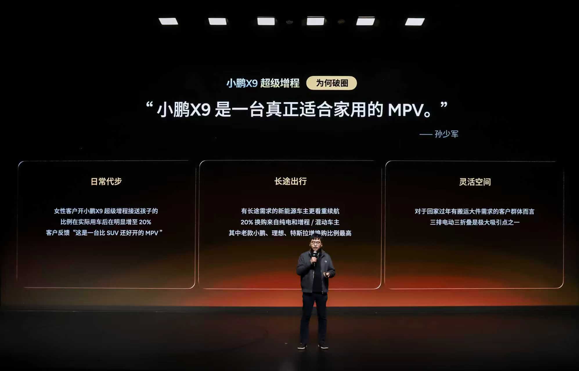年轻人开的最多MPV是小鹏X9增程版,90后占比57.2%,00后占比13.7%,同时小鹏X9超级增程在北方核心城市销量增幅超300%,打破品牌地域限制。小鹏X9超级增程兼顾轿车的个性、SUV的操控,MPV的超大空间,真正的宜家出行。今年小鹏开启「移动充电站」公益合伙人计划,目前已有1000位小鹏X9先锋车主加入,用户可在春运路上使用V2V车对车充电。小鹏X9年轻家庭的第一台MPV小鹏X9超级增程首个用户画像报告发布