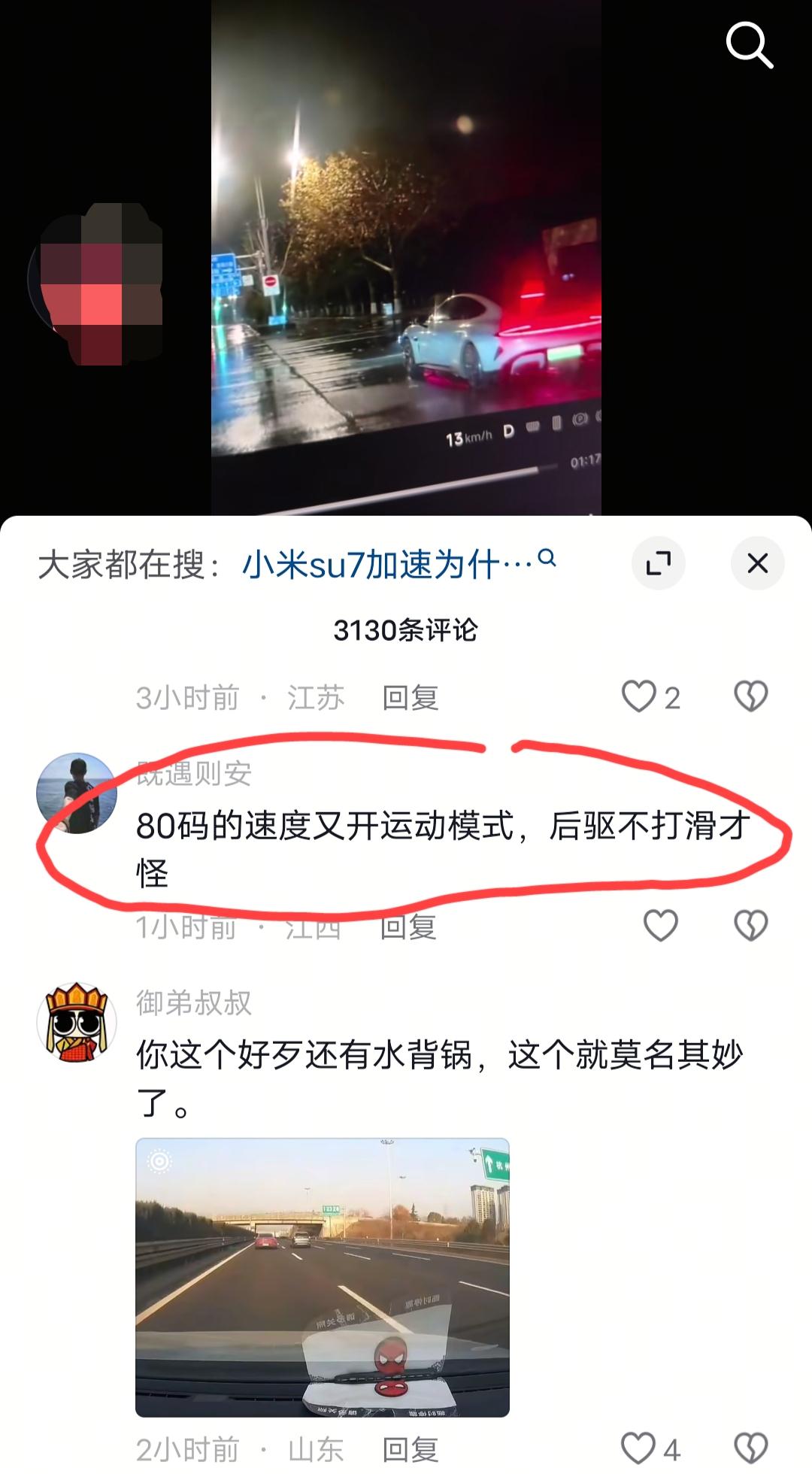 小米su7单车打滑事故,这难道又是雨天路滑? 当时视频车的速度是80码,而且看到小米车刹车灯亮了一直在减速,所以,小米车当时的速度应该是低于80的。 评论区有网友表示:80码的速度又开运动模式,后驱不打滑才怪。 我就纳闷了,这位网友咋知道小米车主开的是运动模式,靠臆想出来的吗?洗也不是这么个洗法吧,能不能整点新词出来!