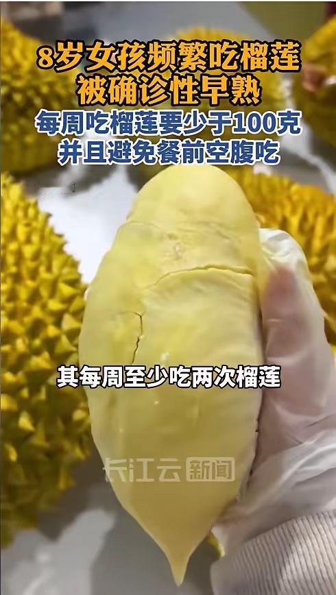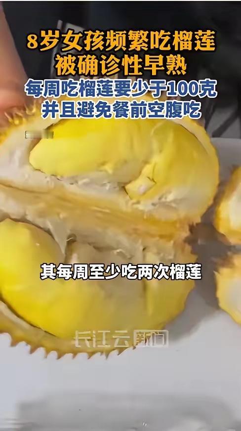 “悲剧还是发生了!”近日,福建福州,一8岁女孩的妈妈给孩子洗澡时,突然发现她的乳房出现了异常发育的迹象,带孩子就医后竟被确诊为性早熟。更令人意外的是,医生排查所有诱因后,锁定的“元凶”竟是孩子每天都在吃的榴莲!网友:吃榴莲还能性早熟? 据媒体1月15日报道 这位妈妈发现女儿乳房微微隆起,摸上去有硬块,孩子还总喊疼。她赶紧带孩子到医院检查,医生诊断孩子确实出现了性早熟迹象。在详细问诊过程中,医生发现孩子特别喜欢吃榴莲,家里每周至少买两次,每次几乎都是她一个人吃完。 榴莲糖分和热量都很高,熟透的榴莲还可能含有酒精成分,孩子经常过量食用容易导致营养过剩。当儿童体内脂肪积累过多,体重超过30公斤时,可能会刺激身体启动性腺轴,从而引发发育提前。有网友曾分享自己一周吃三个榴莲后月经提前半个月的经历,这也从侧面印证了榴莲的“大补”特性。 榴莲本身并不含人体性激素类似物,不会直接干扰激素水平,性早熟通常是多种因素共同作用的结果,除了饮食,还包括晚睡、缺乏锻炼、长时间使用电子产品等。这个女孩除了爱吃榴莲,平时也喜欢玩手机、睡得晚,这些因素叠加在一起才导致了问题。 如果女孩在8岁前出现乳房发育,男孩在9岁前出现睾丸增大,就应该及时到儿科或内分泌科检查。通常需要做骨龄测定、激素水平检测和B超等检查来明确情况。 预防性早熟饮食方面要均衡搭配,多吃新鲜果蔬和优质蛋白,少吃高热量零食。每天保证充足睡眠,最好有1小时左右的户外运动。避免给孩子乱吃补品,像蜂王浆、某些儿童保健品都可能含有激素成分。 这位妈妈现在后悔不已,她原以为水果多吃无害,没想到反而害了孩子。再好的食物也要适量,榴莲虽美味,但儿童每周食用量最好控制在100克以内,避免餐前空腹吃。 各位读者你们怎么看?欢迎在评论区讨论。