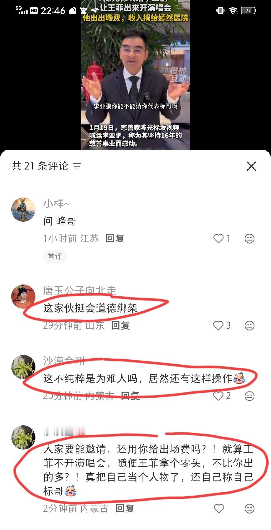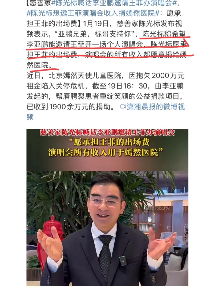 “陈光标喊话李亚鹏邀请王菲开演唱会”被网友诟病是在道德绑架:这不纯粹是为难人家李亚鹏吗?人家要能邀请,还用你给出场费吗,就算王菲不开演唱会,随便王菲拿个零头,不比你出的多! 不过,也有网友是站队陈光标这边的:不是说“论迹不论心论心无完人”,如果李亚鹏愿意邀请王菲,王菲也愿意出来,标哥也会出这个钱,这个事情有何不可。再说了,王菲作为“嫣然天使基金”的发起人,尽自己的绵薄之力,助医院度过难关,有何不可? 评论区诸位网友,你们怎么看这个事情?