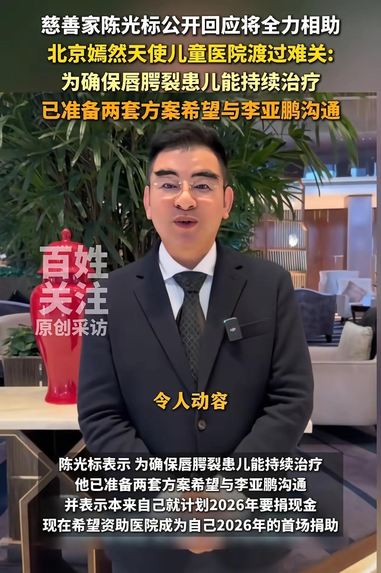 陈光标喊话李亚鹏,把银行卡号提供给他,他可 以再捐1300万 紧接着就放出了第二套硬核方案,要是这1300万还填不上嫣然医院的窟窿,他就全资收购,钱一次性付清,连医护人员 的安置问题都包圆儿了。 害,这话 一出,网上直接炸开了锅,有人翻出他 过往的高 调操作,说他就是 借李 亚鹏的困境蹭热度作秀,也有人实打实夸他,说标哥向来是高调但办事儿靠谱,掏的都是真金白银,不是嘴上画饼那种。 刚刷到条扎心评论:“我看他之前就爱高调,这次收购医院,估计是想 蹭热度 吧,还是真有爱心,” 唉,这话戳中了不少人的疑虑。 其实吧,标哥这高调慈善的路子,可不是一天 两天练出来的,就说今年6月底,贵州榕江遭灾,他是第一个冲上去的民营企业家,拉着2000万的医用物资就往灾区赶,他亲自押车,送物资到榕江,还带了一两百万现金,专门帮那些家破人亡的特困家 庭渡难关,最后榕江县委书记还给他发了手 写聘书,这待遇,可不是谁都能拿到的(说真的,这行动力我服了)。 哦对了,2023年底甘肃地震那 回,他也是雷厉风行,当天就凑了总价值1300万的物资,还有20台大型救援设备,连夜往灾区运,啥6万套棉 服棉被,5000个手电筒,1000箱方便面,连卫生巾卫生纸都备得足足的,甚至还有100台发电机,全是灾区最急需的玩意儿。 更早 的2020年武汉疫情,那时候全国口罩都抢不到,他直接跑到武汉当志愿者,捐了100万只优质口罩,300台手提式消毒喷雾机,50吨消毒液,防护服和护目镜各5万套,连大米蔬 菜都拉了上百吨,那时候物资奇缺,这些东西可真是雪中送炭,救了不少人的急。 讲真的,我当时刷到这些新 闻的时候,都有点懵,这反应速度,这办事儿效率,绝了啊,不过也难怪有人质疑,毕竟他每次慈善都搞得人尽皆知,不像有些 大佬默默捐款不留名,但 话说回来,不管高调还是低调,真金白银 砸出去了,能帮到需要的人,这不就够了嘛? 回到这次的事儿,李亚鹏的嫣然医院,16年坚持做儿童唇腭裂救助,确实不容易,这些年帮过的孩子没有上千也有几百,网友心疼这份坚持,已经捐了1300万,标哥再补1300万,这加起来2600万,要是能补上资金缺口,医院就能继续运转,那些等着做手术的孩子也不用断了希望。 要是这钱还不够,他直接全资收购,对医院来说也不算坏事,至 少医护人员不用愁失业,孩子还能继续接受治疗,总比医院关门大吉,孩子无处求医强吧,当然,也 有网友出了个更周全的主意,说标哥不如把医院大楼买 下来,免费租给李亚鹏管理,这样既帮了忙,也保住了嫣然医院的招牌,算是两全其美。 ① 要是标哥真捐 了1300万,嫣然的燃眉之急大概率能解,2600万的资金,足够医院撑上好一阵子,继 续给孩子做手术。 ② 要是他真的全资收购,对医院的医护和患者来说,也是稳了,不用怕工资 发不出,不用怕治疗中断,比硬撑着关门强太多。 ③ 至 于作秀的质疑,其实没必要揪着不放,真金白银的捐赠摆在那儿,能帮到人就是好事儿,哪怕顺便赚了点关注度,那又怎样? 讲真的,不管标哥这次是出于啥目的,只要能帮到嫣然医院,帮到那些等着做手术的唇腭裂孩子,这事儿就值得点赞,高调怎么了,高调还能带动更多人关注儿童慈善呢,总比那些光说不做,只会嘴炮的人强一百 倍。 你觉得标哥这次是作秀还是真慈善呢?