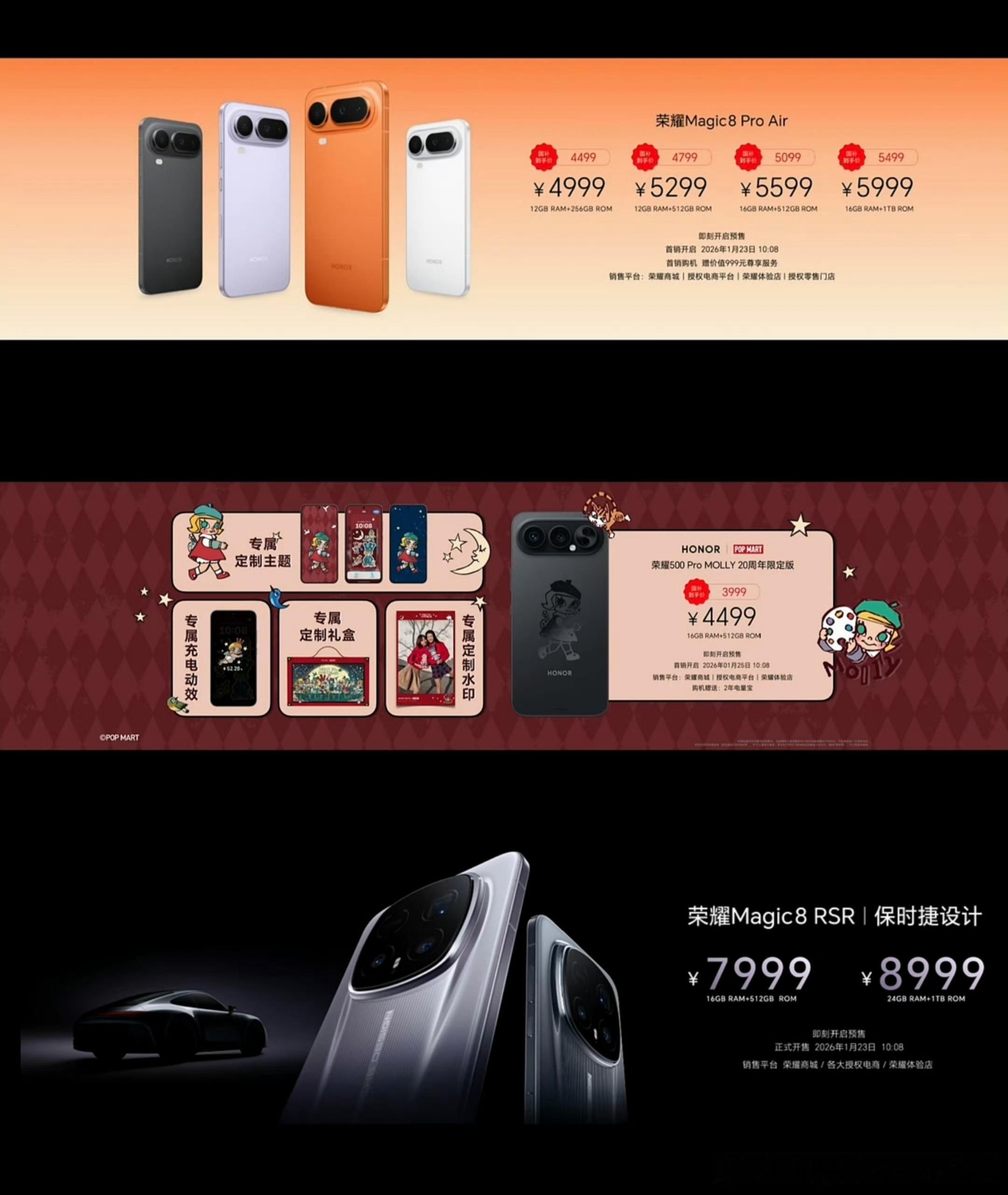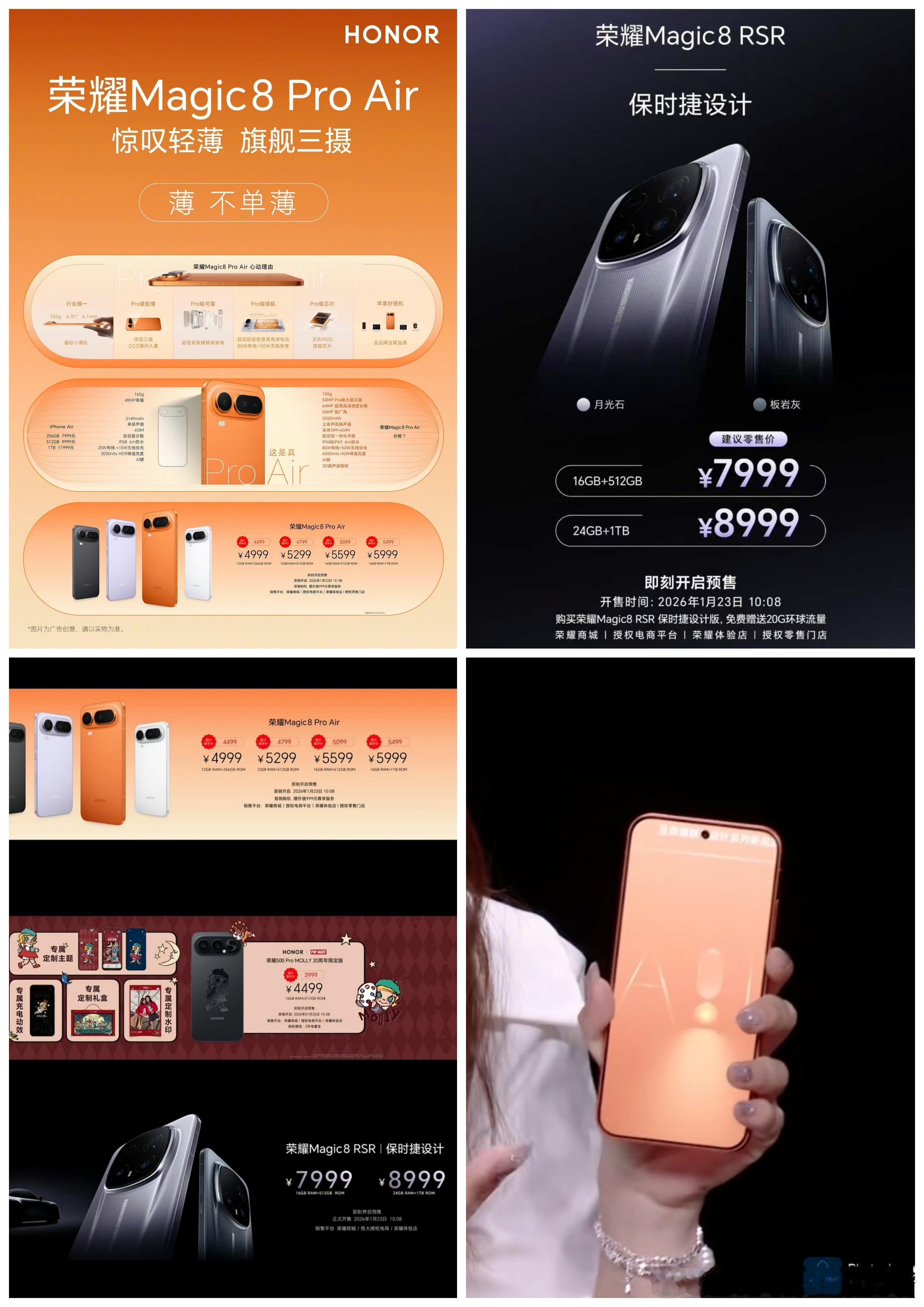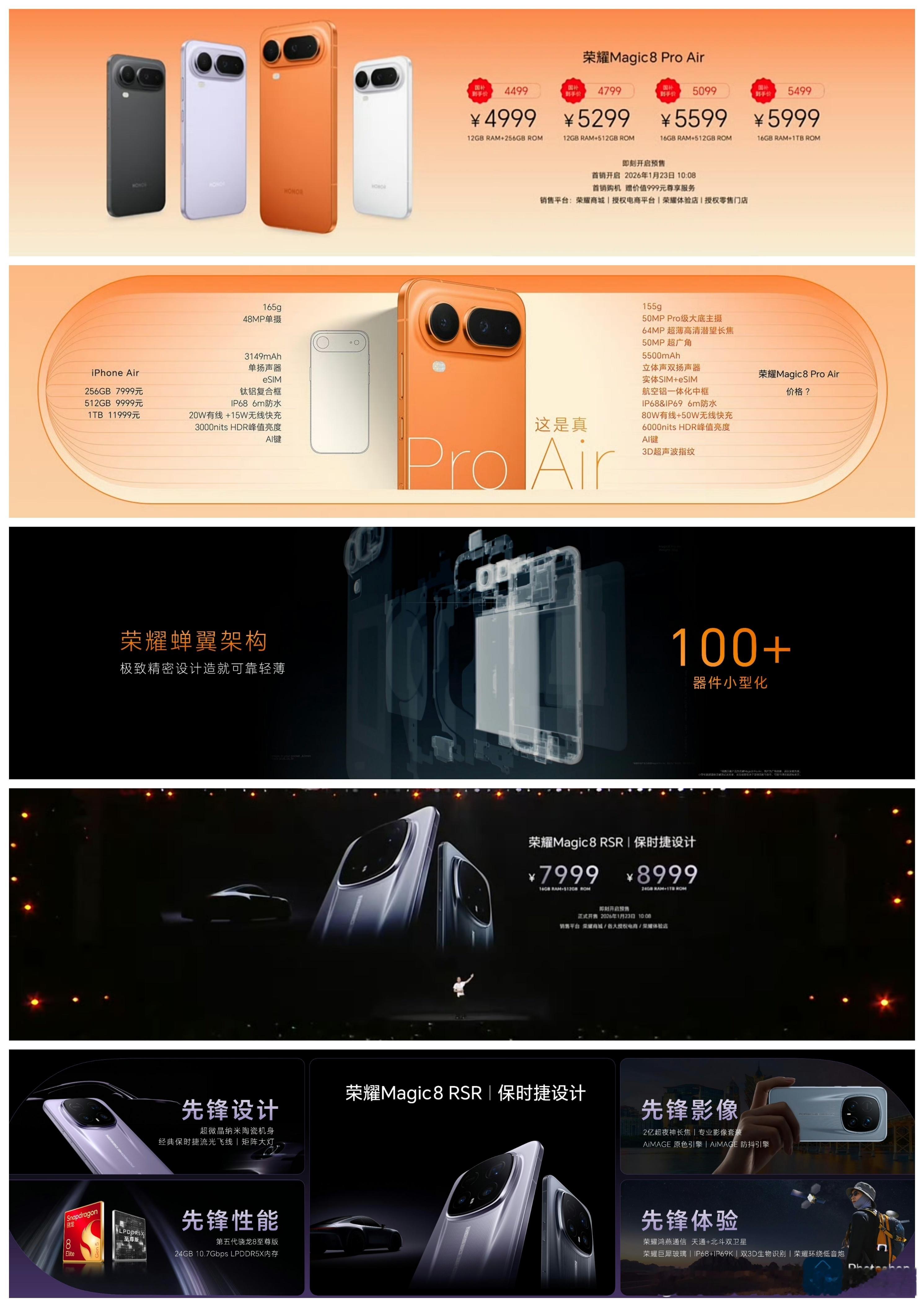 荣耀Magic8 Pro Air,对抗iPhone Air的轻薄旗舰手机,售价4999元至5999元。荣耀Magic8 RSR保时捷设计,两个配置,售价7999元至8999元,顶配24GB内存真不错。大家觉得如何?荣耀发布会