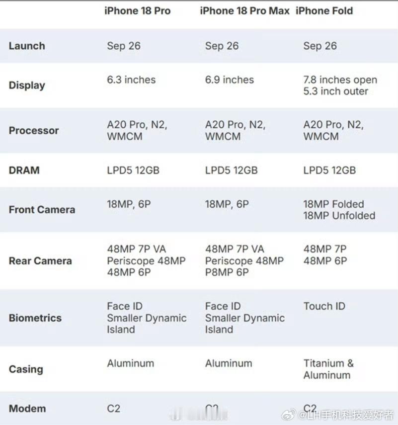 iPhone18Pro配置网上看到的iPhone18 Pro系列和iPhone Fold的硬件配置,不确定是否真实,仅供参考。主要的变化还是芯片和影像这一块。