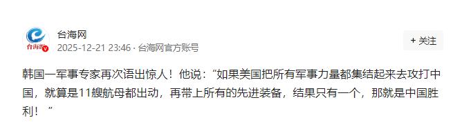 韩国一军事专家再次语出惊人!他说:“如果美国把所有军事力量都集结起来去攻打中国,就算是11艘航母都出动,再带上所有的先进装备,结果只有一个,那就是中国胜利!” 个韩国军事评论员这回可是说了句震惊四座的大实话,直接给那些还沉浸在“11艘航母称霸世界”旧梦里的美国人泼了一盆透心凉的冷水。这位专家的话说得特别露骨:哪怕美国把家底全掏空,11艘航母加上所有先进装备一股脑儿全拉过来跟中国打,结局也只有一个——中国赢!这话传到大洋彼岸,估计五角大楼那帮决策者听了连觉都睡不踏实。 其实这韩国专家真不是在故意捧杀,他是在给美国人算一笔细思极恐的“劝退账”。美国那个叫“新美国安全中心”的智库自己搞过兵棋推演,结果极其惨烈:一旦台海那边动上手,美军只要敢掺和进来,头一个礼拜伤亡人数就能冲破2万1千人。这是啥概念?这一个礼拜死的伤的,比美军过去二十年在全球到处打仗加起来的总和还要多。 更要命的是,推演结果显示还得搭进去两艘核动力航母。这一艘航母沉了,不仅意味着一百五十多亿美元瞬间打了水漂,更意味着船上五千多名水兵要跟着喂鱼。在如今这种高强度的现代化对抗里,美国以前那种海上霸主的地位早就悬了。 为啥航母不管用了?说白了就是咱们的反舰导弹织了一张逃不掉的大网。像东风-21D和东风-26,那射程不仅覆盖台海,连关岛都跑不掉。这些导弹飞起来速度能达到音速的10倍,而航母拼了老命跑也就30节,在导弹面前跟静止没啥区别。留给美军拦截系统的反应时间连8秒都不到,这种压迫感谁能顶得住? 再说了,打仗打到最后拼的是消耗。咱们这边造导弹跟下饺子似的,产能是对手的好几倍;反观美军,那些死贵的远程导弹真打起来,几天库存就得见底。咱们背靠着强大的本土产业链,能边打边补,美国那边是越打越少,一边是弹药告急,一边是火力不断,这仗还怎么往下接? 除了导弹,天上和海上的较量美国也不占便宜。咱们的福建舰那是8万吨级的大家伙,电磁弹射几千次都没毛病;你看美国的福特级,平均弹射41次就得趴窝修一修。 到了2025年,中国空军现役战机快两千架了,光是那顶尖的隐身战机歼-20数量就突破了300架,稳坐全球第二把交椅。再加上歼-35挂着鹰击-21高超音速导弹,第一岛链早就被锁得死死的。推演都预判了,冲突一开始,美军在亚太的飞机九成得被干掉,连关岛的安德森空军基地也保不住。没了制空权,航母编队就是海上的活靶子。 当然,除了拼装备,还得拼这股气。回想1950年的长津湖,零下40度的严寒,志愿军穿着单衣急行军,愣是顶住了人类历史上最密集的炮火。那近20万烈士用命换来的胜利告诉全世界:这个民族被逼到绝境爆发出的力量是能撼动天地的。 看看现在,咱们北斗导航、量子通信都有了,海军舰艇总数也超过了美国。反观美国,造船工业衰落得不成样子,修船造船都费劲,他们在西太平洋的弹药储备顶多撑5天的高强度作战。连俄罗斯专家都补刀说,真打起来美军一周可能得损失十万人。面对这么悬殊的后勤差距和可怕的战损比,五角大楼哪来的底气开战? 归根结底,那位韩国专家并不是在神话中国,他只是把窗户纸捅破了,说出了一个美国政客不愿意承认的事实:现在的美国,工业底子虚了,介入台海的代价大到他们根本承受不起。就算航母再多,也掩盖不了他们后勤拉胯、体系衰退的致命硬伤。