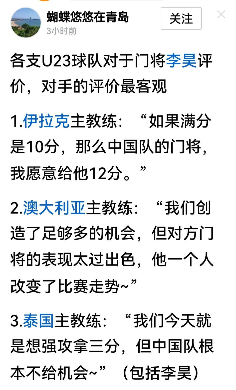 论身材,李昊1米87,高大威猛很霸气;看面容,李昊五官正派,英武方正很帅气。不仅是姑娘,连我这个老男人也对他喜爱至极。[大笑] 最让人喜欢的那两颗大门牙,不仅洁白而且给力,如足球场上的门神一般,让队友欢呼雀跃,令对手扼腕叹息。 网友汇总几个交手球队主帅对李昊的评价,伊拉克教练说10分制他给12分,澳大利亚教练 说他1人改变了走势,泰国教练说他不给我们任何机会,乌兹别克教练说他太出色,一步步硬扛着国足晋级。 明晚与越南队的半决赛,希望小昊继续上演大门牙传奇,把昊字拆开来,帮国足打出日天的胜利,让广大球迷进一步体会小昊美之为美。[点亮平安灯][点亮平安灯][点亮平安灯]