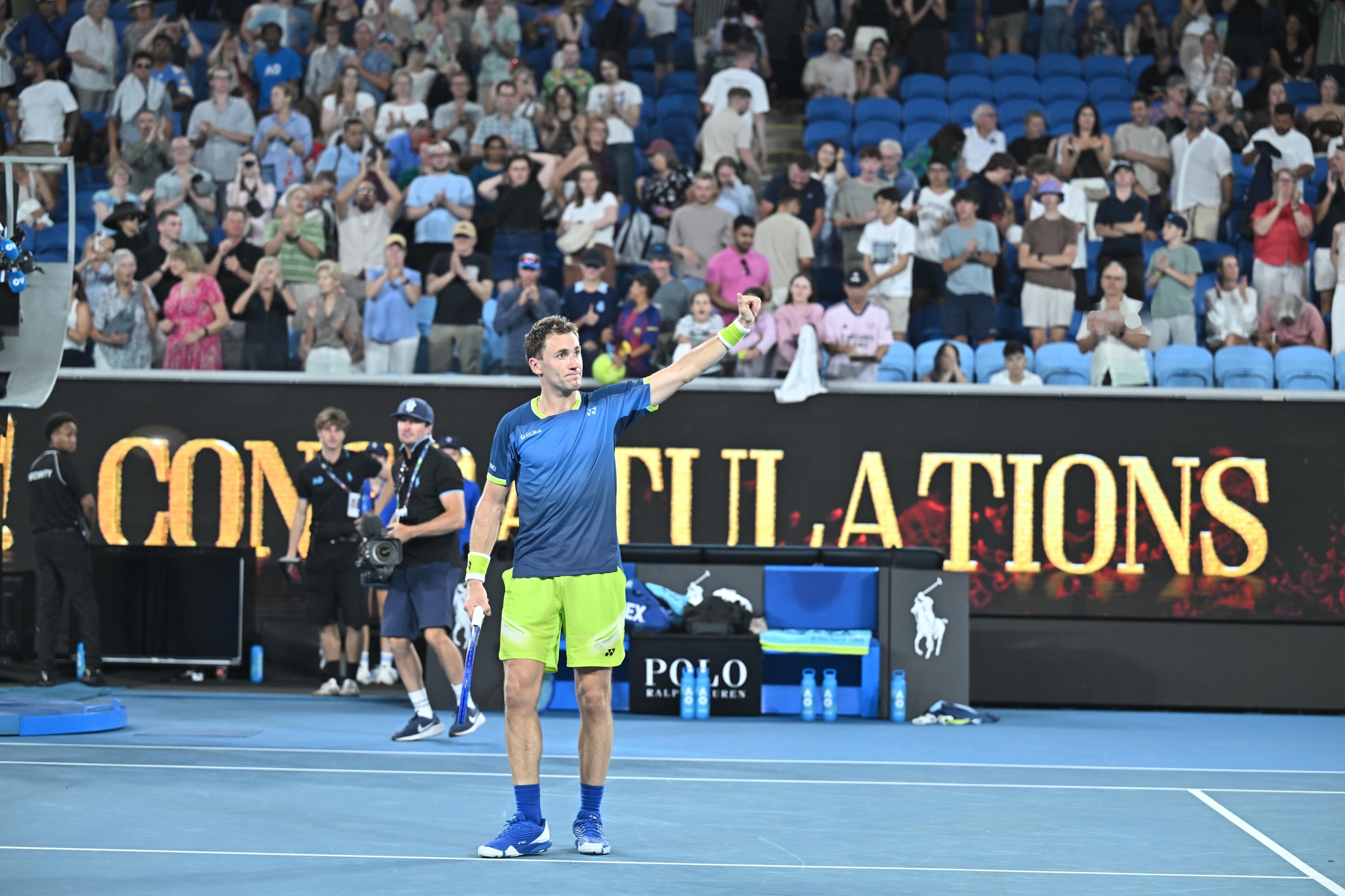 澳网首轮,来自法国的21岁资格赛球员热亚,以7-5、7-6、7-5的比分将17号
