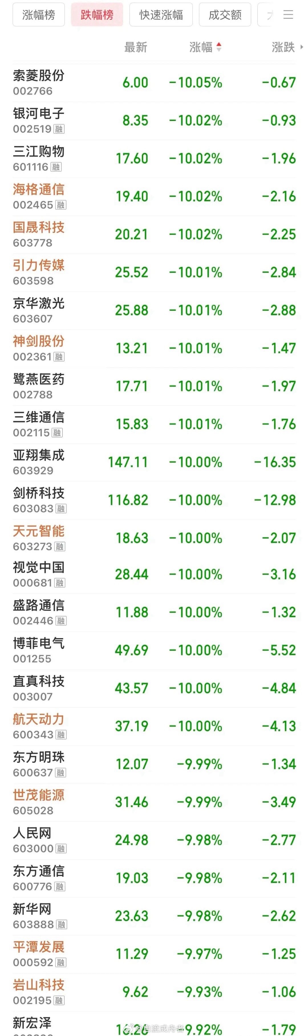 今日市场跌停股数量达25只,开盘时曾有32只股票以一字跌停价开出,开盘后随着情绪稍稳,部分已连跌三四天的个股打开跌停,但仍有不少个股在打开后再度回封,或虽未回封却收于大跌状态。• 华夏幸福:早盘已是第四个一字跌停,跌停封单近300万手,不少投资者以为会跌停收盘。但开盘15分钟后封单撤去,跌停板打开,随后股价直线拉升,盘中一度触及涨停(从跌停到涨停振幅近19个点)。不过,因该股2025年净利润预告亏损240亿,净资产、净利润等多项指标为负,年报后存在退市风险,不少投资者选择离场(多数投资者成本在3元左右,今日最高价仅1.74元)。最终该股收涨8.86%,距涨停仅差2分钱,后续走势难料,且存在被实施ST退市风险警示的可能,抄底需警惕风险。• 岩石科技:早盘跌停封单460万手,较昨日的660万手减少约三分之一,但大额封单仍让持有者不安。开盘半小时后封单撤出,跌停打开,盘中跌幅最小收窄至4.65%。持有及抄底资金期待其反包(已连跌3天),但主力出货意图明显,缺乏大资金拉升,最终股价再度下探,收于接近跌停位置,反包失败。• 人民网:此前因文化传媒板块行情收获5连板,上一交易日突发一字跌停且未打开,今日延续一字跌停,全天未开板,交易量与换手率均未放大,明日能否开板存疑。• 亚翔集成:年内从24元涨至今日盘中169元,涨幅超6倍。上一交易日在高位股集体跌停时仍涨停,被认为走势强势。今日低开后一度涨3.75%,开盘十分钟内有4亿资金涌入,但随后迅速被砸至跌停,全天未开板,追高资金单日亏损约13%。• 海格通信:已连续3个一字跌停,今日多数连跌3天的个股打开过跌停,但其始终维持一字跌停至收盘,收盘时仍有262万手封单(对应资金50.8亿)。该股近两个月累计上涨85%,涨幅不算最高,下跌却尤为迅猛。此外,今日跌停个股还包括:索菱股份、银河电子、三江购物、国晟科技、引力传媒、京华激光、神剑股份、鹭燕医药、三维通信、剑桥科技、天元智能、视觉中国、盛路通信、博菲电气、直真科技、航天动力、东方明珠、世茂能源、东方通信、新华网、平潭发展。