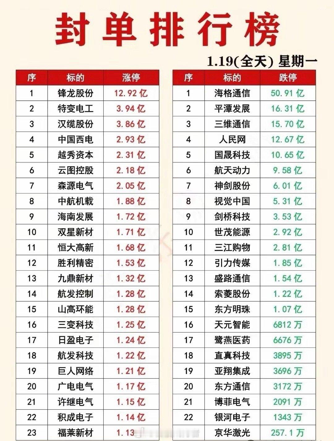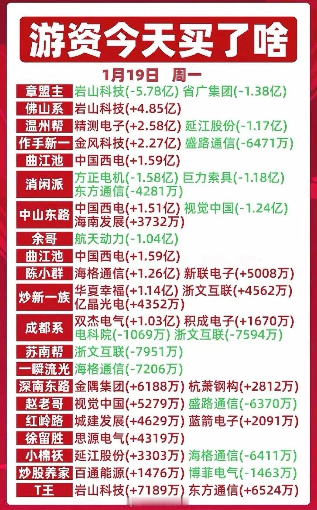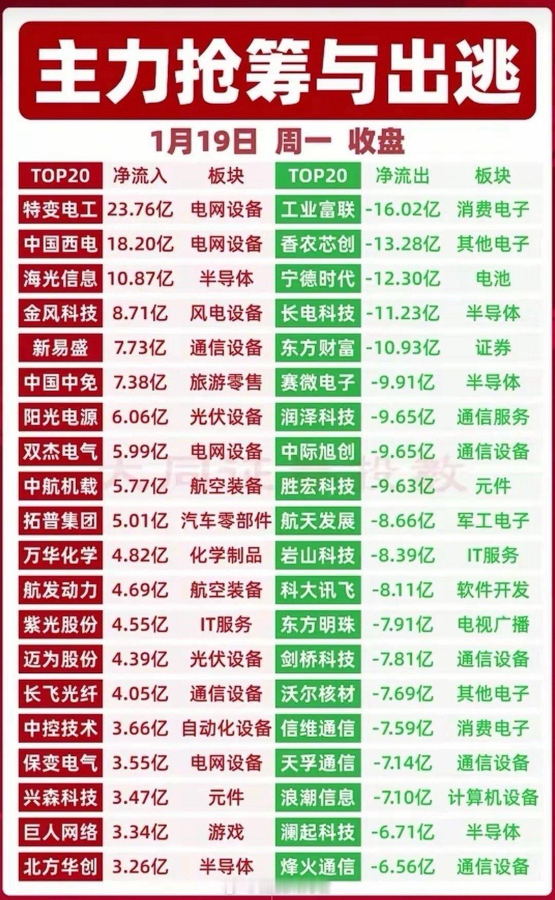 1月19日市场复盘速递🔥游资动向:多空对决激烈佛山系豪掷4.85亿重仓岩山科技,章盟主却反手砸盘5.78亿,上演直接博弈;中国西集成香饽饽,曲江池、中山东路联手扫货超3亿;海格通信、浙文互联则出现明显分歧,大佬买卖博弈凸显市场情绪波动。💰主力资金全景:赛道分化显著电网设备板块成吸金王,特变电工、中国西电合计净流入超41亿;半导体、风电设备等赛道也获大笔资金抢筹。另一边,消费电子、半导体板块遭主力大幅出逃,工业富联、香农芯创等龙头净流出均超13亿,宁德时代、东方财富也在抛售名单中,资金动向暗藏风口切换信号。📈封单排行榜:多空力量极致分化锋龙股份以12.92亿涨停封单强势领跑,特变电工、汉缆股份等电网设备股紧随其后,成资金抱团热门;跌停板上,海格通信50.91亿封单格外刺眼,平潭发展、三维通信等也被巨额封单摁住,尽显市场分化与博弈。⚠️理财有风险,入市需谨慎!资料取材网络,仅供参考,不构成投资依据。