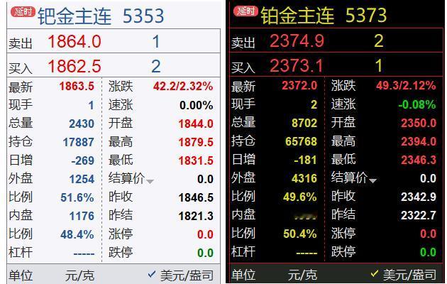 马上又十二点了, 看下国际钯金和铂金情况。 纽约NYMEX交易所的 钯金主力合约报价1863.5美元, 较上一日上涨2.32%; 铂金主连报价2372美元, 较上一日上涨2.12%。 看来明天广期所的 铂金和钯金期货高开概率比较大!
