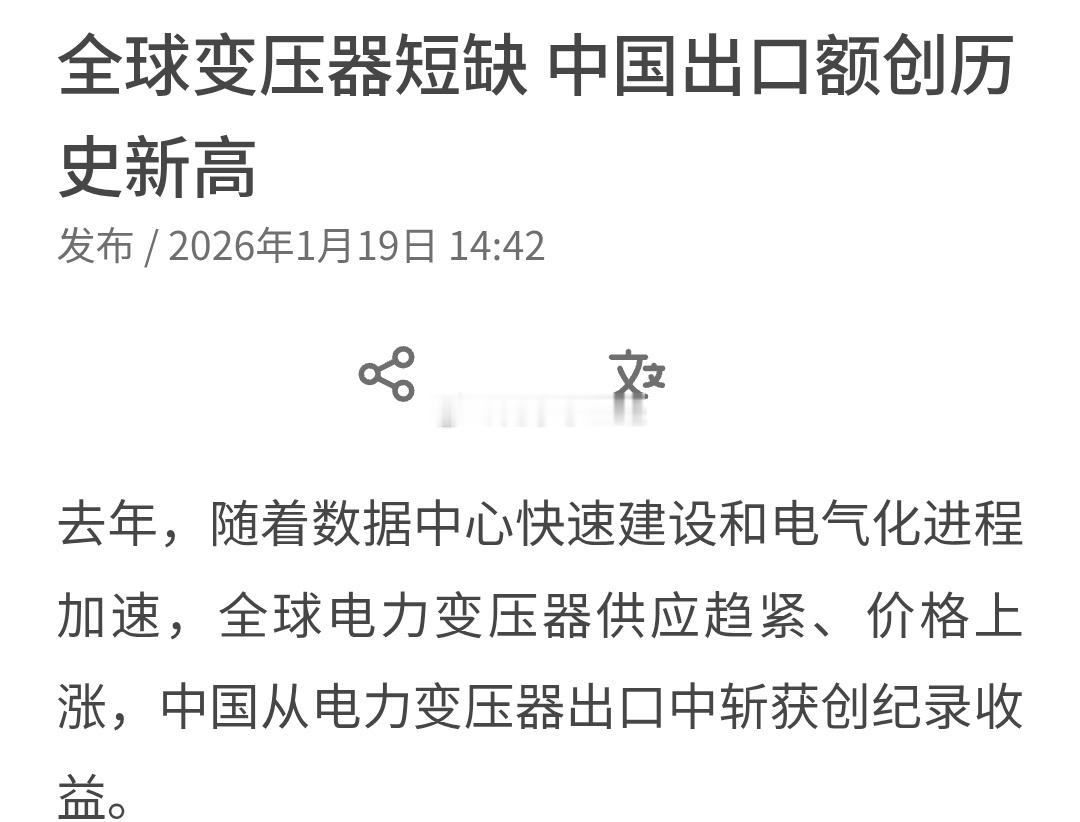 转,全球变压器紧缺,中国出口创新高AI 算力扩张 → 电力约束显性化 → 电网基建需求前置去年10月已提示,当前数据正在兑现这一判断