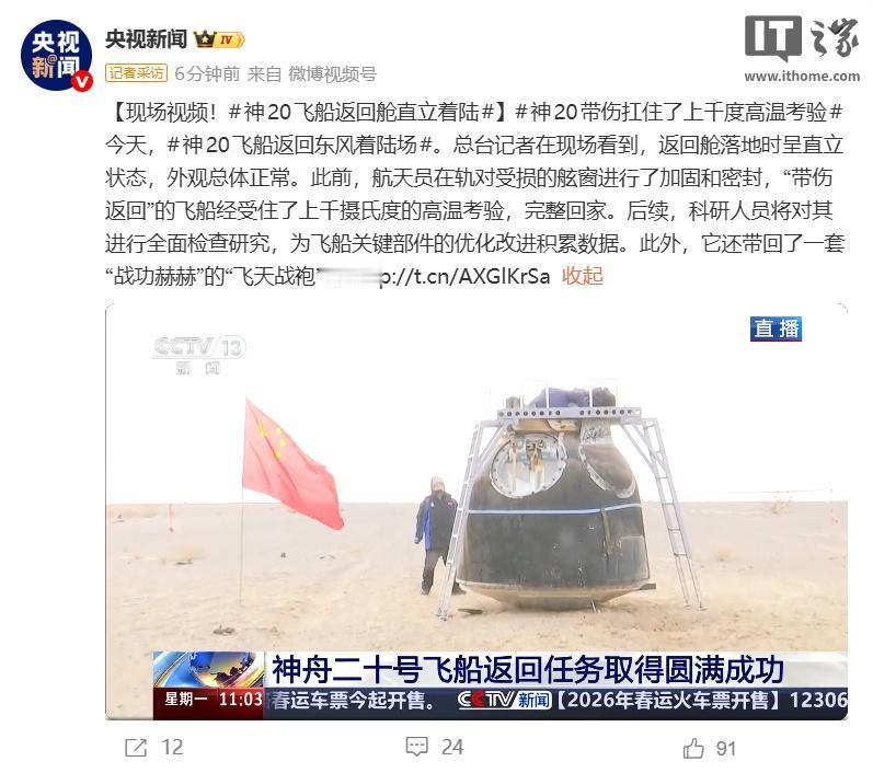 1月20日,据央视新闻直播间报道,昨天上午9点30分,神舟20号返回舱以无人状态返回,在东风着陆场成功降落,经过现场检查确认,返回舱外观总体正常,舱内下行物品状态良好。 据统计,神舟20号载人飞船在轨时间270天,验证了飞船在轨停靠9个月的能力。 神舟20号航天员乘组原计划2025年11月5日搭载神舟20号载人飞船返回地面,神舟20号航天员发现,飞船舷窗玻璃出现三角形裂纹形。 为确保航天员安全任务圆满成功,返回任务推迟进行,经过专家们分析认为,决定神舟20号乘组搭载神舟21号载人飞船返回。 实践证明,神舟20号载人飞船超期服役,状态良好,安全可靠,质量优良。[赞][赞][赞][赞][赞][赞]