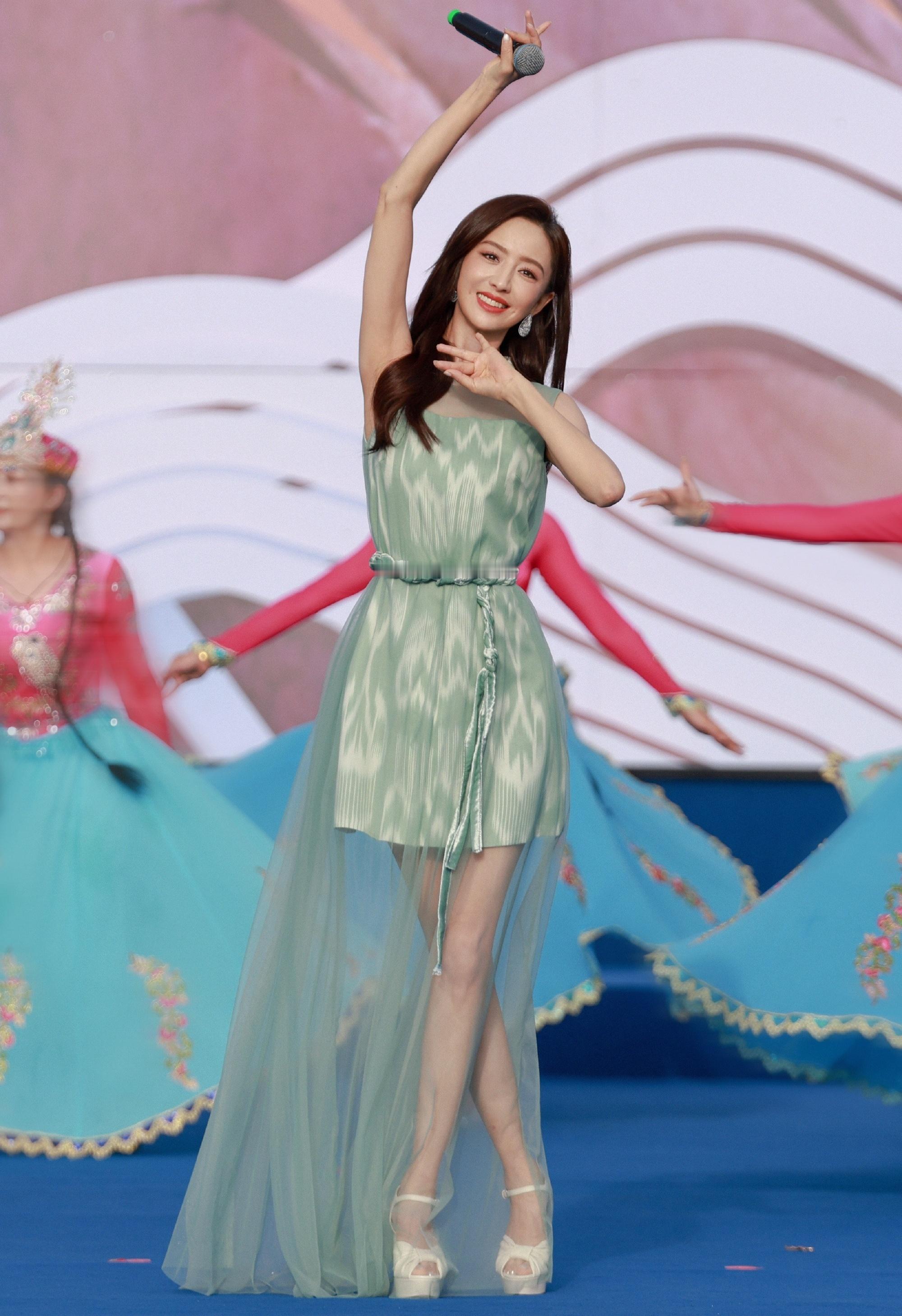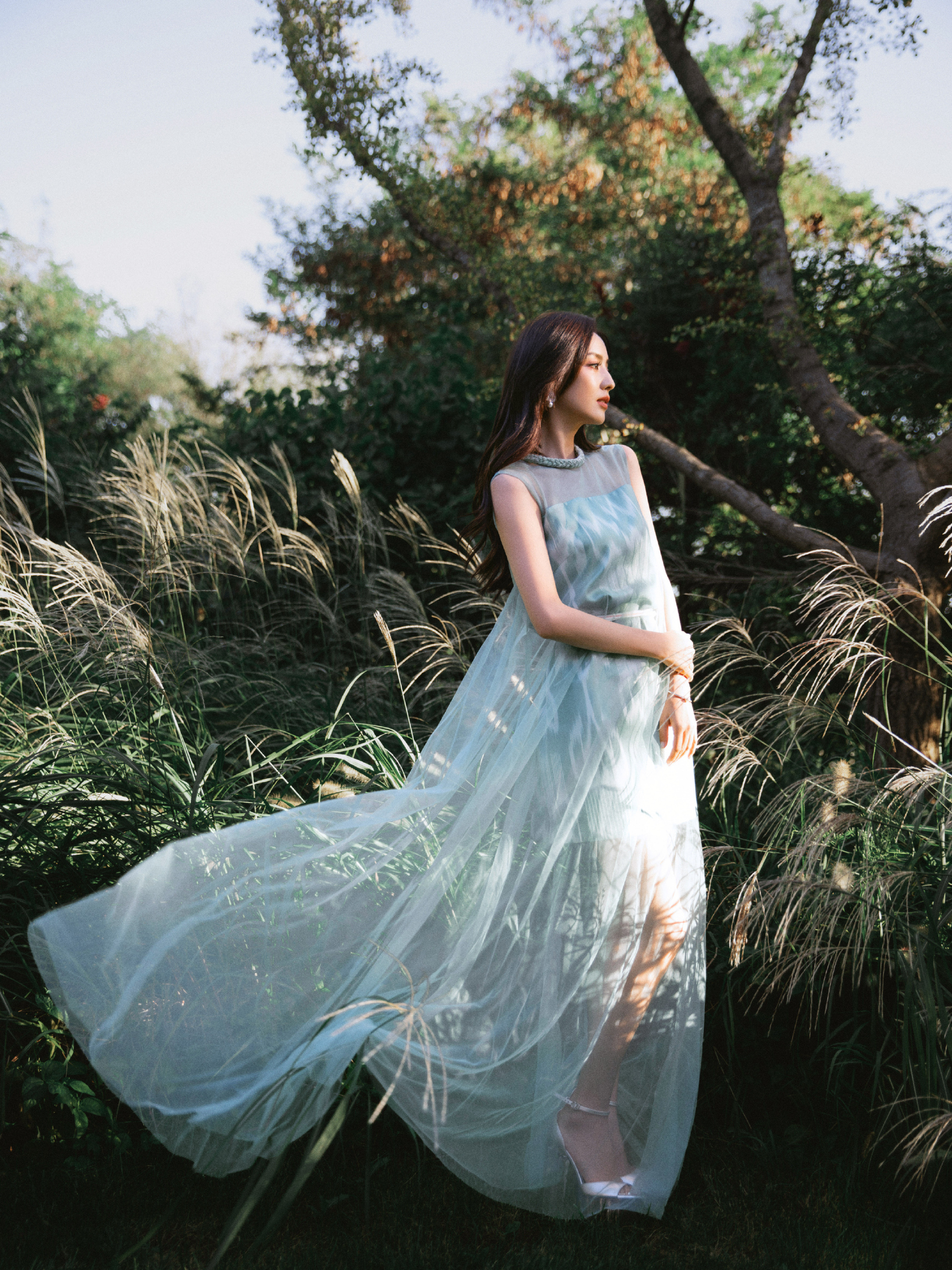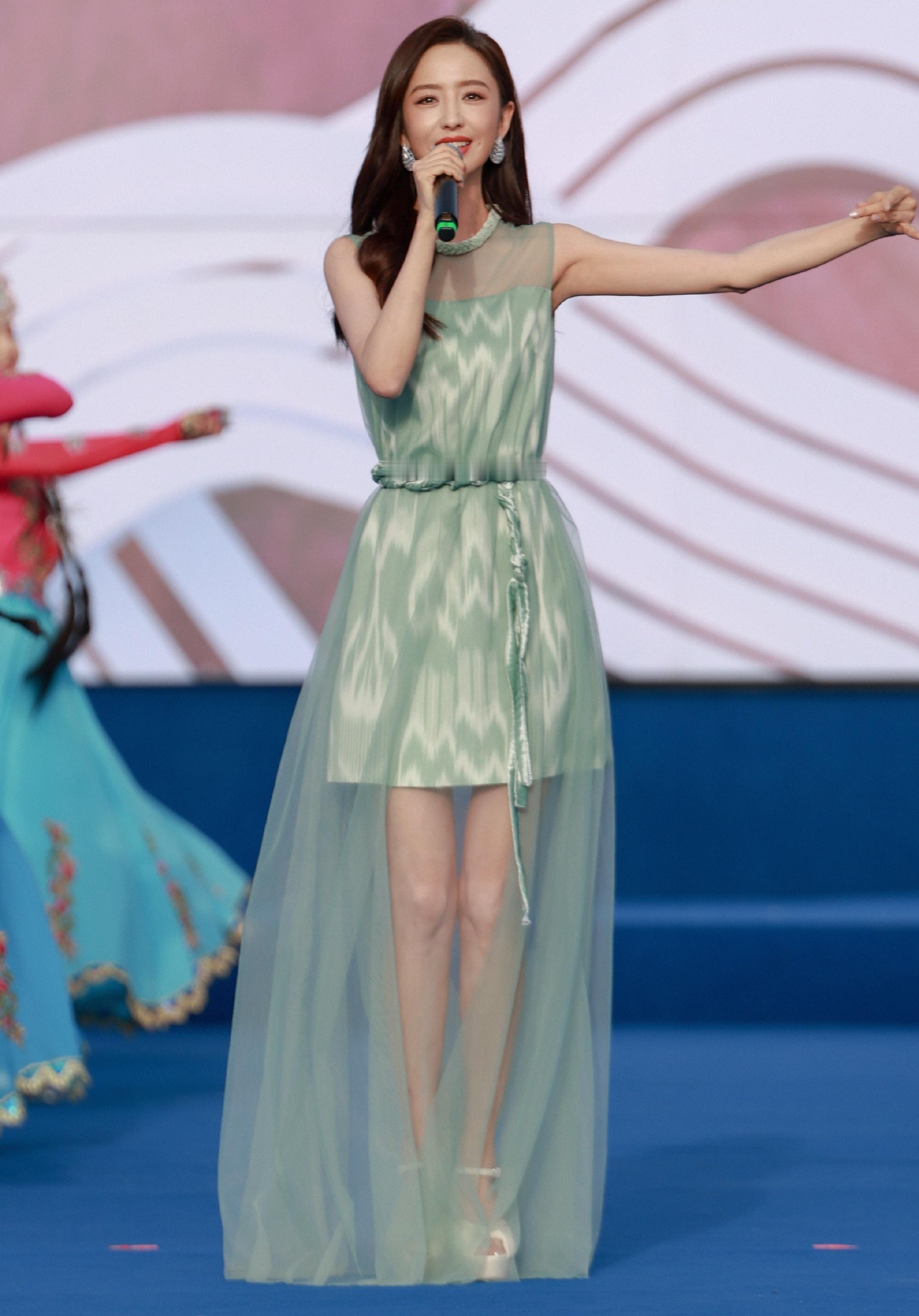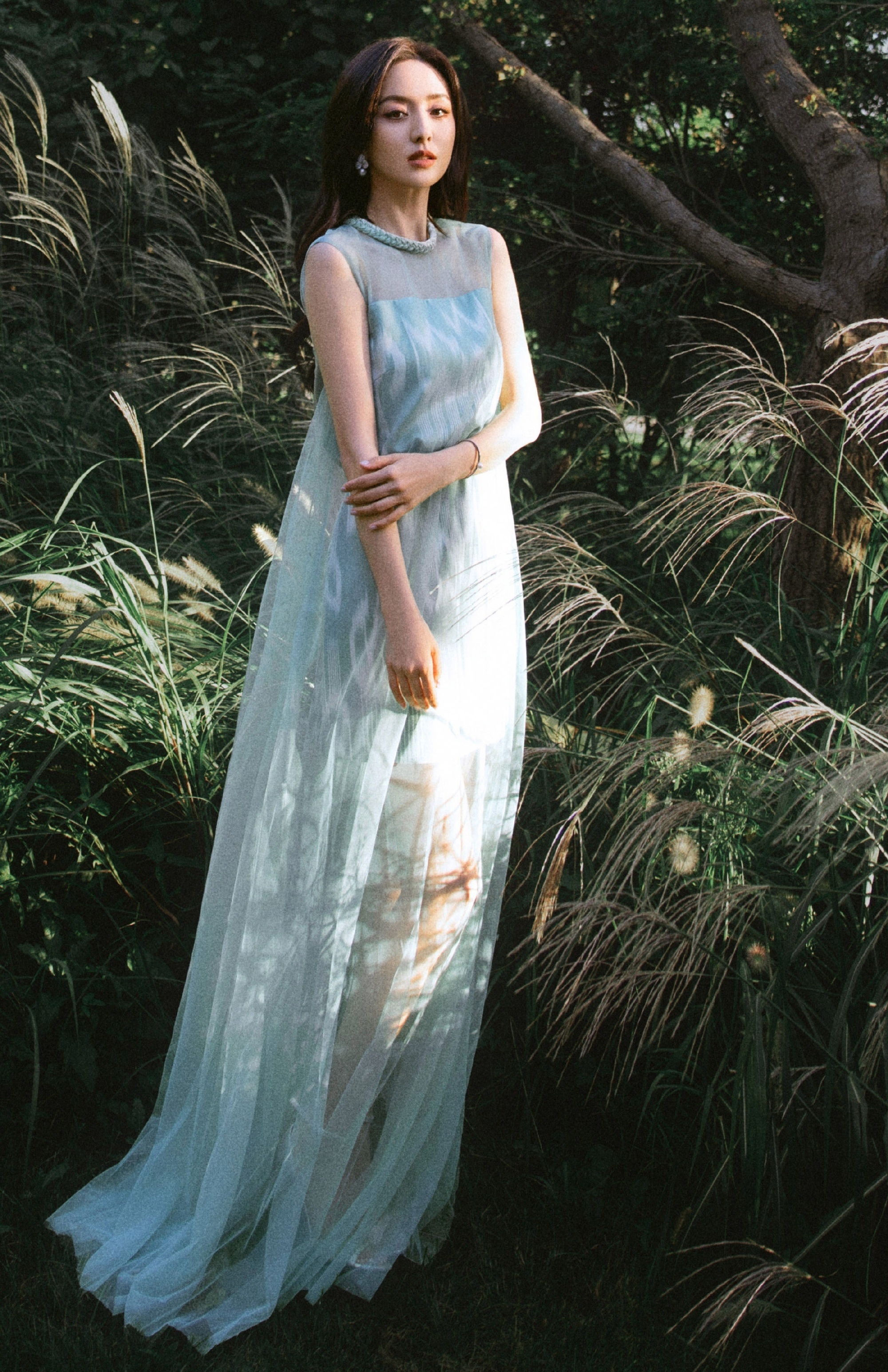 佟丽娅浅绿色纱裙穿搭,柔美优雅的丫丫状态真好。佟丽娅