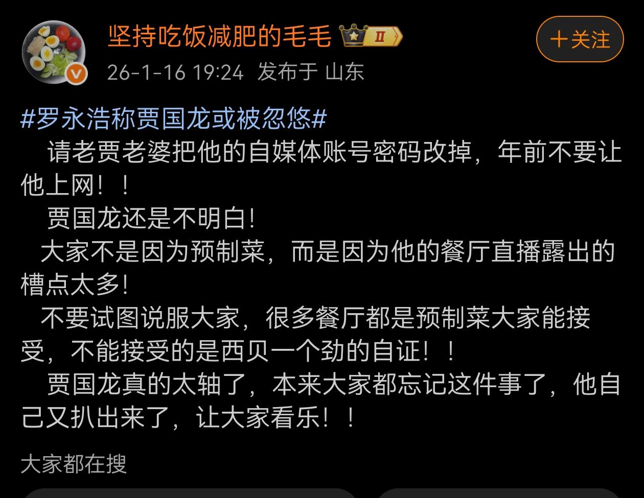 建议贾国龙老婆赶紧把自己老公的自媒体账号密码修改掉!这个网友呼吁贾国龙老婆赶紧把老贾自媒体账号密码改掉,让他别在网上乱说了,简直是越说越糟糕。这位网友真是难得的大好人啊!自从贾国龙和罗永浩掐起来后,他身边平时那些道貌岸然的铁哥们,竟然没有一个劝架降噪的,都是拱火的、泼油的。把贾老板整得一直高吊在半空中下不来。你说你们坏不坏,缺不缺德?做人可不能这样啊!