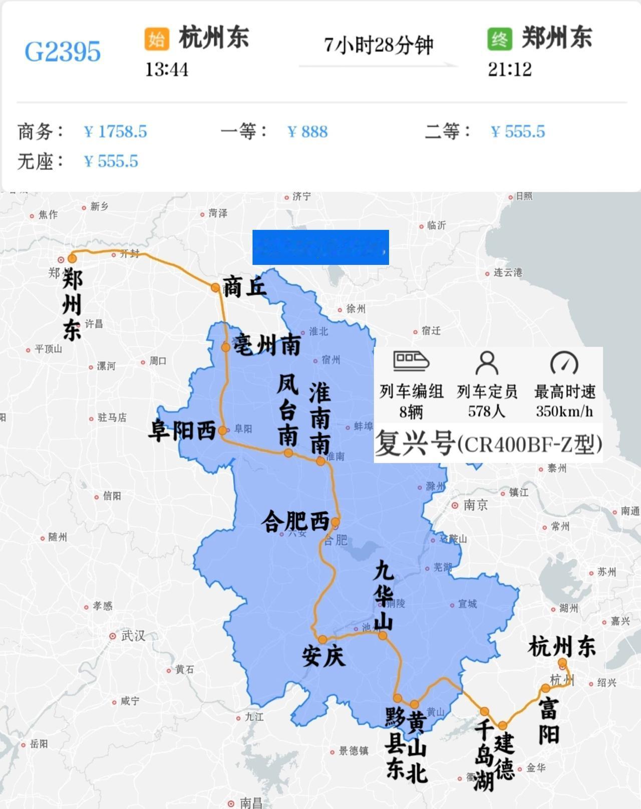 郑州东到九华山G2396/G2397次 杭州东到郑州东G2395/G2398次 G2396次是郑州到九华山唯一一趟高铁,郑州东站7点55分开,12点40分到九华山站,用时4小时45分钟。