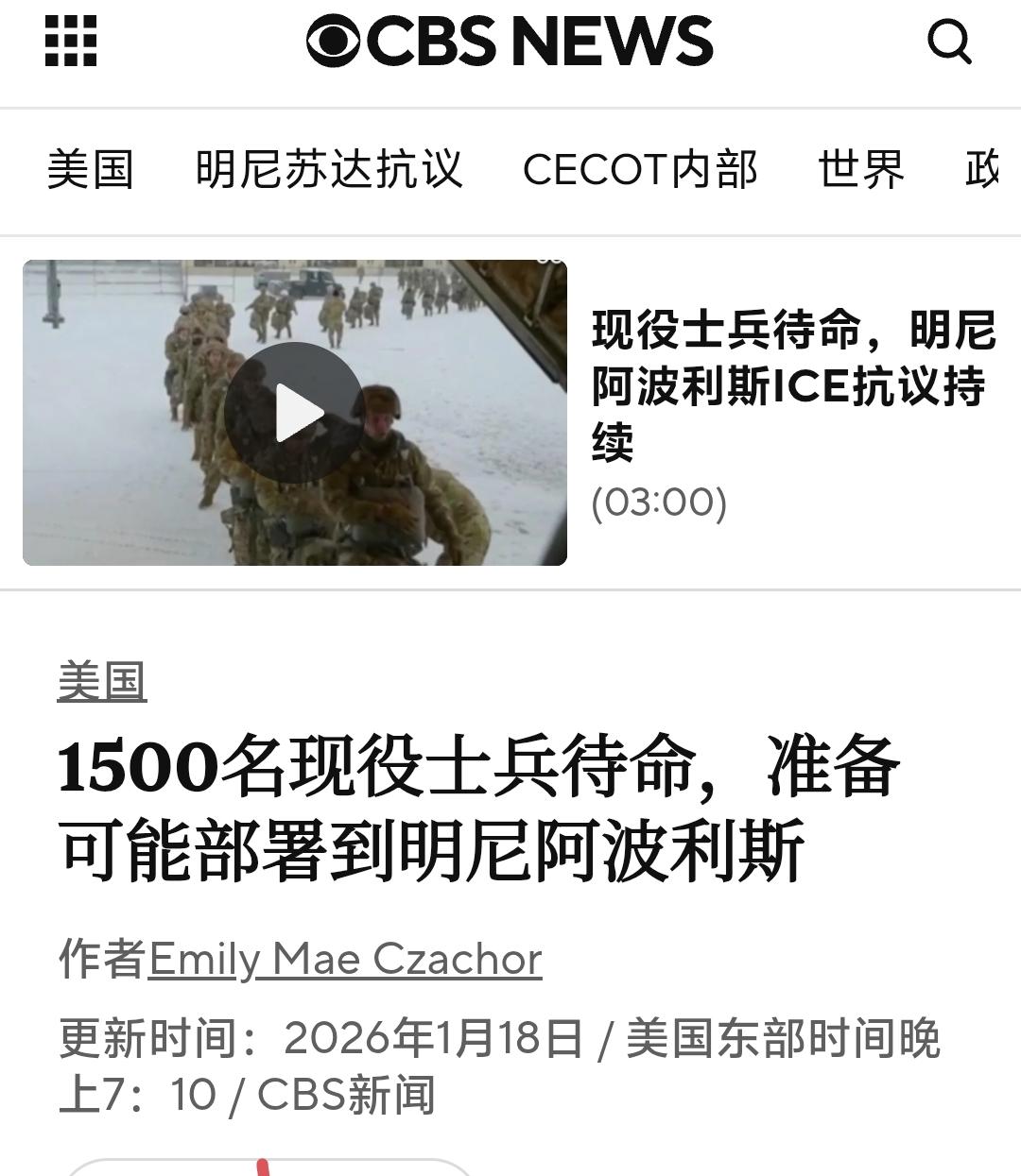 后方不稳!美国明尼阿波利斯局势升级 1500名现役士兵待命驰援 特朗普海外伊朗、加沙、格陵兰多个地方进展顺利,没想到后方突遭变局。 据CBS新闻消息,美国国防官员证实,约1500名现役士兵已进入待命状态,或随时部署至明尼阿波利斯。 不久前当地因移民与海关执法局(ICE)官员开枪致一名女子身亡引发大规模抗议,紧张局势持续升级。 据悉,该女子在一次移民执法行动中无辜遭ICE官员枪击身亡。 事件发生后当地民众发起抗议活动,10日零下严寒中仍有上万人走上街头,组织者预估人数最高达4万。 随后抗议持续不断,还迅速蔓延至全美,华盛顿、纽约、费城等数十座城市接连爆发超千场示威活动,民众齐声反对联邦暴力执法,要求追责涉案人员。 抗议快速引爆,也有特朗普移民政策积累的内部矛盾的爆发,也不排除有特朗普政治对手助力。 特朗普开始指责古德违法,但全美抗议发酵后,特朗普14日不得不改口,称这是“不幸事件,对双方而言都令人难过”。 但该表态并没有平息抗议活动。 此次美军士兵待命,是为应对当地持续升级的局势。 美国现役部队也可以镇压抗议活动吗? 特朗普认为可以依据《叛乱法》出动部队,但当地官员反对。 去年特朗普曾经准备启用《叛乱法》,不过最终被法院否决。 如果特朗普认为有可能演变成大规模骚乱,会再次启动《叛乱法》。 这批部队就将部署到明尼苏达州。 特朗普会启动《叛乱法》吗?美国最高法院会同意吗? 大家可以吃瓜,文明讨论。 ICE官员暴力执法 美国移民执法抓捕引发抗议你怎么看
