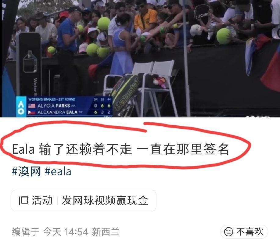 网友发文吐槽:菲律宾球员艾拉输了还在那里赖着不走,一直在那里签名。 评论区网友表示:大家还是理解一下吧,菲律宾这个国家难得在网球这个热门球类项目上出了这么一位在亚洲水平算顶尖的球员了,菲律宾球迷对她趋之如鹜也是非常正常的现象,再说菲律宾裔在澳洲的数量还是非常庞大的。这位艾拉一直就是这样,很爱营造星光女王的形象,赢了就表演输了就签名! 球员里面,她这种骚操作应该是独一份吧![捂脸][捂脸][捂脸]