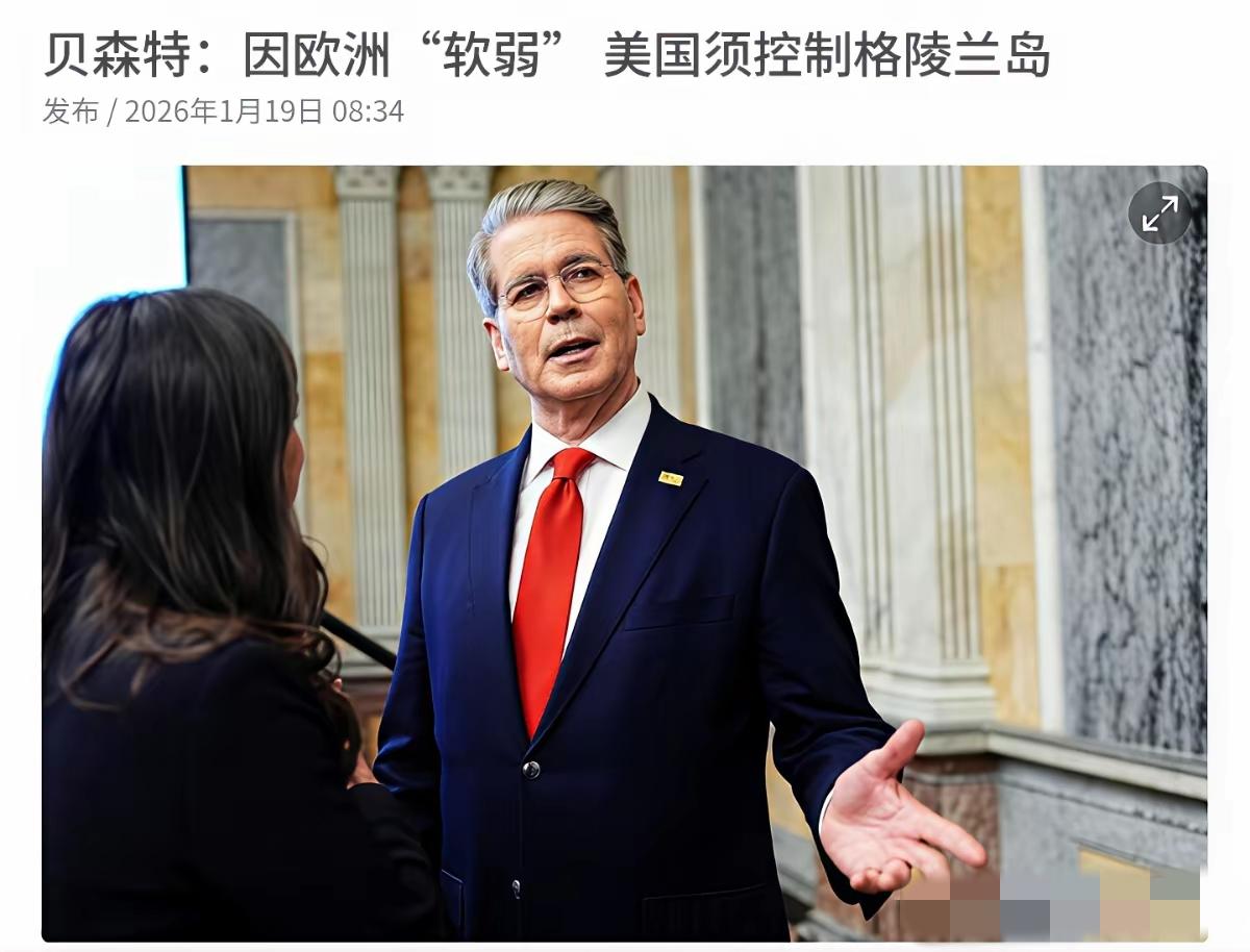 1月19日,外媒报道,美国财政部长贝森特表示,因为欧洲“软弱”,所以美国须控制格陵兰岛。 贝森特虽嘴损,但说欧洲“软弱”没有错,因为欧洲已经对特朗普夺取和霸占格陵兰岛的决心用它们的“软弱”应对做了证明。 更损的是,贝森特继续说,欧洲人(对美国)展现的是软弱,而美国人(对欧洲)展现的是强大。 的确,贝森特太损了,掠夺格陵兰岛也就罢了,还把欧洲人损的体无完肤。但怨谁哪?面对美国可能的“入侵”,要么忍气吞声咽下这口气,要么鼓起勇气大干一把拼个你死我活,可欧洲人偏不,选择了第三条路,由几个国家组建了一支37人的庞大的“北约盟军”前往格陵兰岛展示军事存在,用以吓阻美国的“入侵”。 面对这样不懂事还强装硬汉的欧洲人,突然觉得,贝森特对它们已经是嘴下留情啦。
