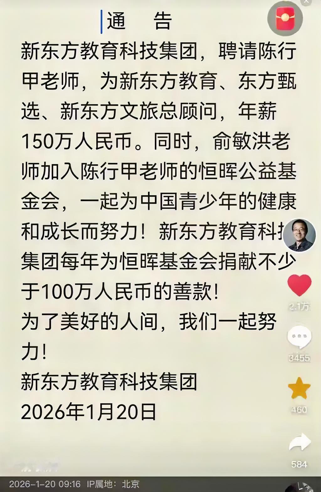 70万年薪争议未平,新东方150万年薪挖角陈行甲!俞敏洪亲自官宣重磅合作,引发全网热议。 1月20日上午,俞敏洪通过社媒披露新东方集团重磅通告:正式聘请公益人陈行甲担任新东方教育、东方甄选、新东方文旅三大板块总顾问,年薪高达150万元人民币。这一消息来得猝不及防,此前陈行甲正因2024年73万余元的公益年薪深陷舆论漩涡。 风波缘起恒晖公益基金会年报披露的薪酬数据:陈行甲2023年薪资90.27万元,2024年为73.01万元。部分网友质疑公益组织任职拿高薪是否合理,也有大量声音力挺——只要账目透明、项目落地,合理薪酬无可厚非。 就在争议发酵之际,1月18日陈行甲发布视频宣布交棒,后续不再从基金会领薪。未曾想短短两日,便迎来新东方跨界邀约。更值得关注的是,俞敏洪将加入恒晖公益基金会,新东方每年还将为该基金会捐献不少于100万元善款,形成公益与企业的双向联动。 从公益年薪争议到百万年薪跨界任职,这场横跨公益与教育界的合作,既打破了行业边界,也让公众对公益可持续发展、人才价值衡量等话题有了更深思考。