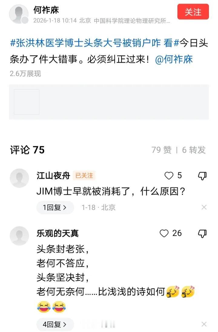 何祚庥近日急火攻心,痛斥今日头条办了件大错事,这是怎么回事呢? 原来何祚庥有两个博士好友,分别是Jim博士和张洪林医学博士,可是老何的两个朋友先后被平台封号,不是禁言而是销号。 原本何祚庥加上他的两个好友,在平台上一唱两和,不管老何说什么都有人捧场,可谓热热闹闹。结果两个朋友先后被封,老何的帖子顿时冷清了下来。 眼见自己的头条无人捧场,难怪何祚庥要坐立不安、来回踟蹰了,老何一把年纪要不要稍安勿躁呢?