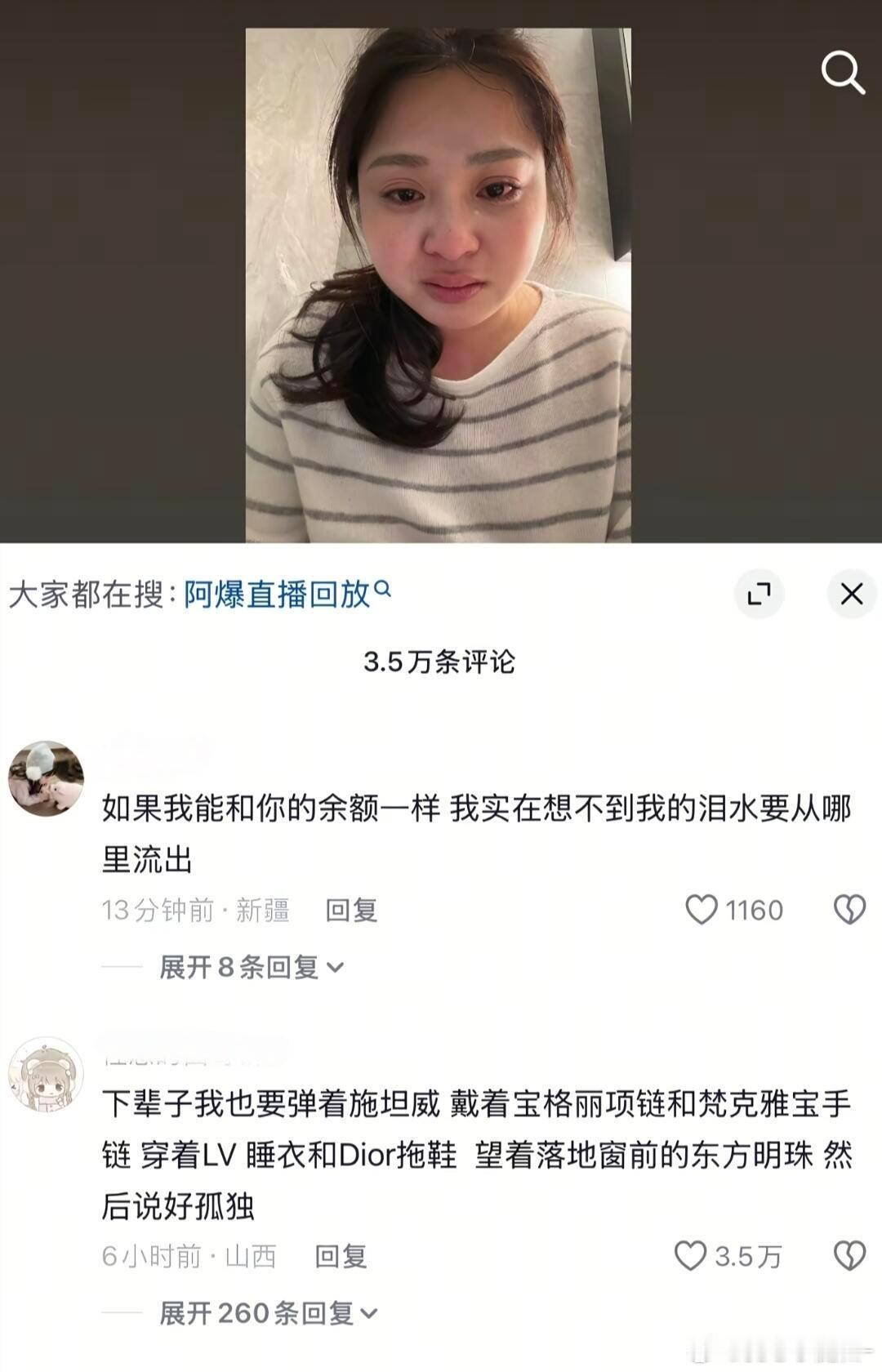 阿爆因为大众讨厌无病呻吟,辛苦工作一天打开手机想放松一下,看一个多金大网红哭诉好孤独…ex???们网红不仅有大钱挣,心里不舒坦了还能发视频散发负面情绪啃食网友精神…阿爆哭诉自己孤独