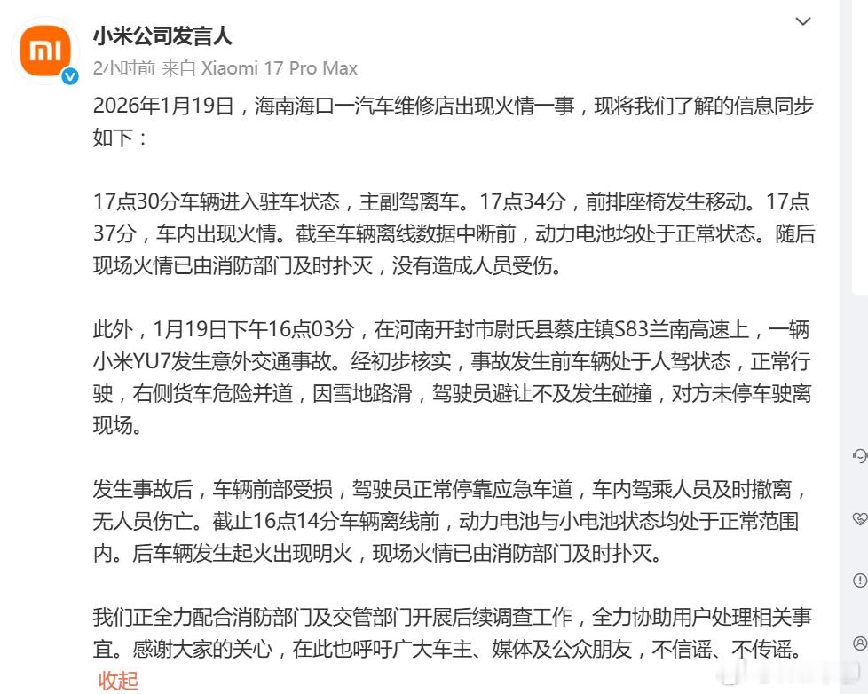 昨天,海南海口汽车维修点,小米汽车燃烧。同天,小米YU7发生意外交通事故,后车辆发生起火。今天通告就出来了,这两起燃烧和动力电池无关,没有检测到动力电池出现问题,这通告的速度是真的快。但到底是为什么起火,比如汽车维修点,是否高压断电情况下维修?这个也存在疑点。因为现在很多维修点都是燃油汽车维修点,维修工是否懂得电气化(高压模组)的相关风险和维修常识?因为燃油车是没有高压电的。小米汽车着火