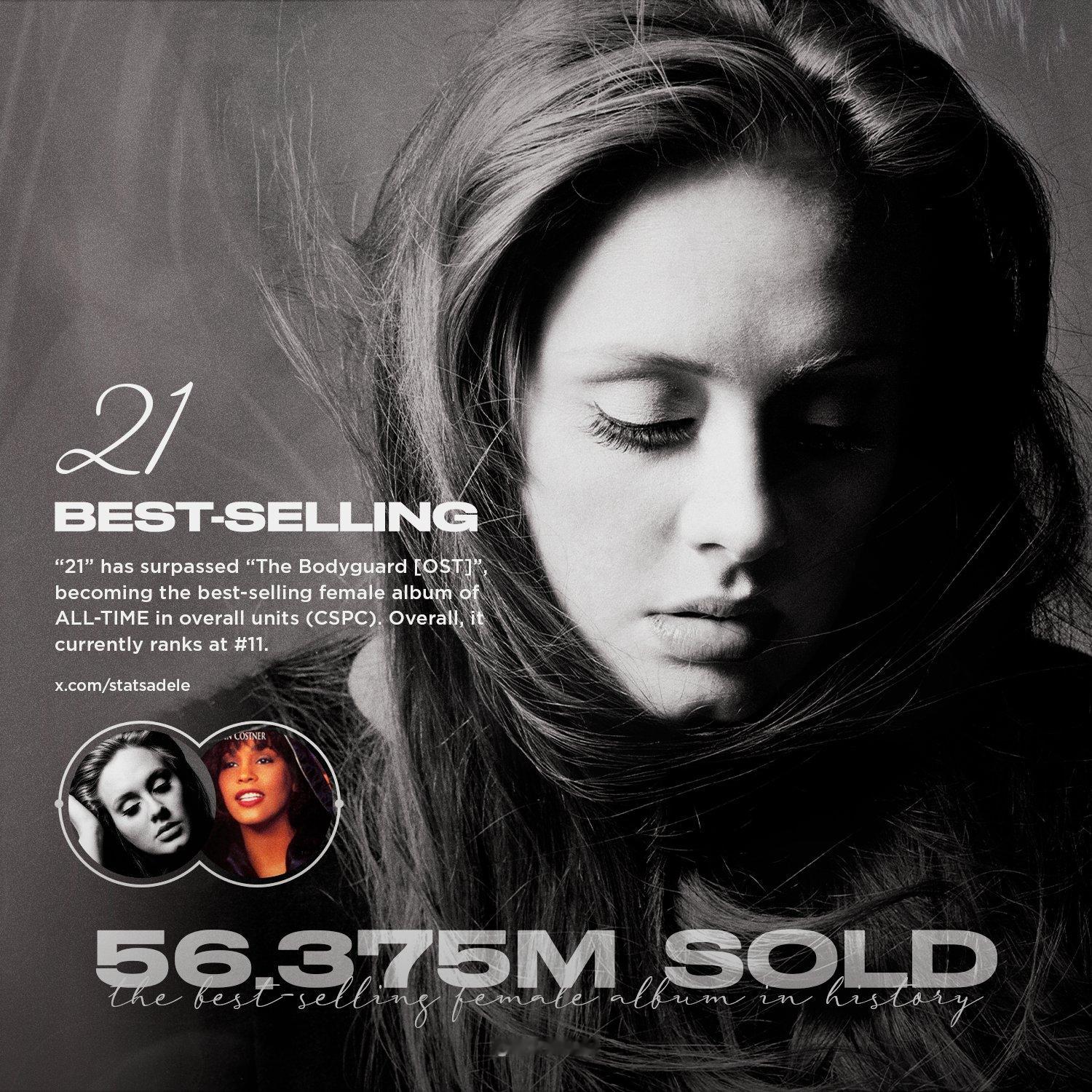 牛X!Adele再创历史第一!神砖《21》全球总销量已达5637.5万张!超越惠特妮休斯顿献唱的《保镖》原声大碟5637.2万张,成为全球音乐史上女歌手总销量最高专辑!同时升至全球音乐史上专辑总销量排行榜第11名!恭喜!