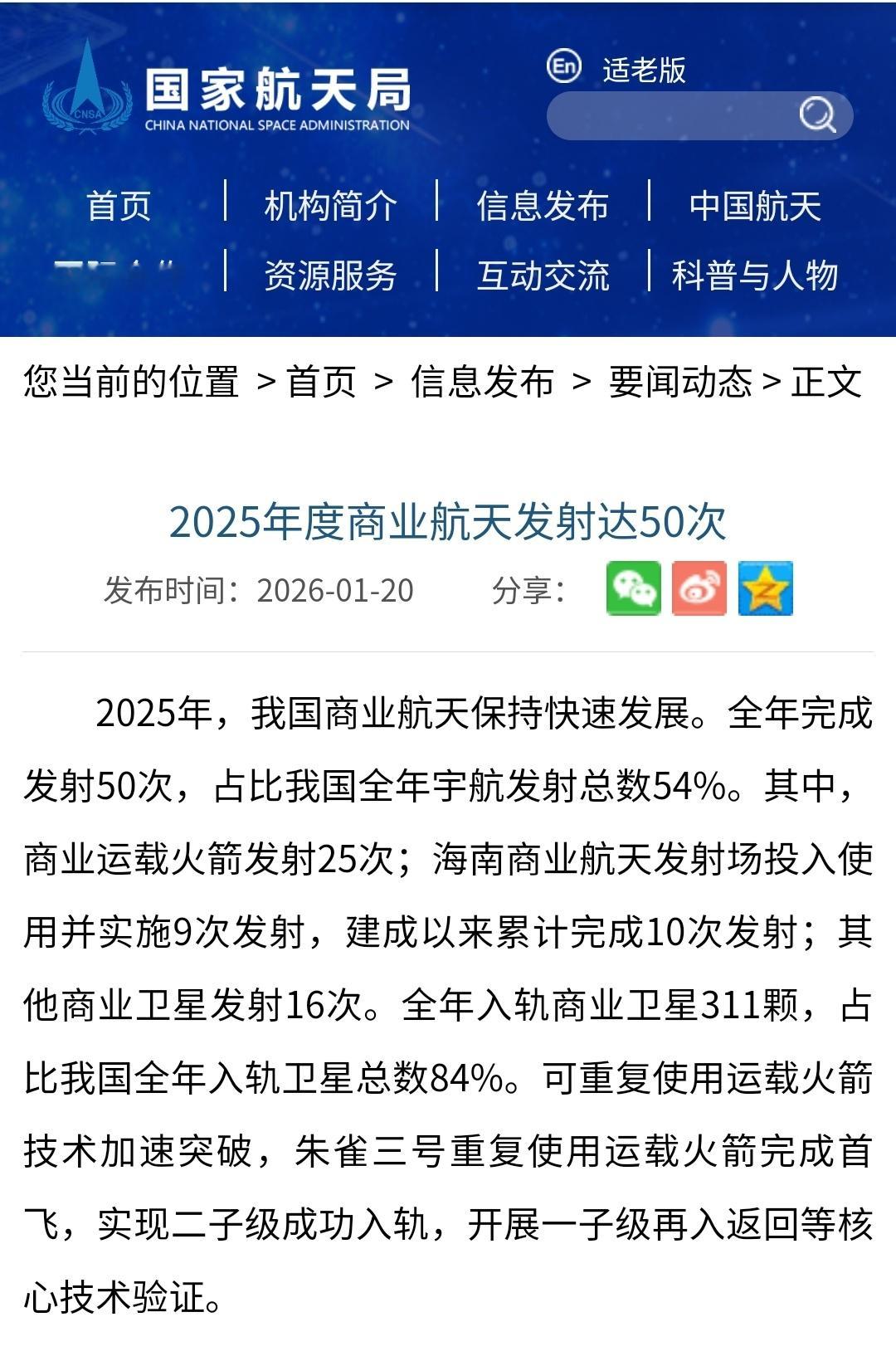 【2025年度商业航天发射达50次】2025年,我国商业航天保持快速发展。全年完成发射50次,占比我国全年宇航发射总数54%。其中,商业运载火箭发射25次;海南商业航天发射场投入使用并实施9次发射,建成以来累计完成10次发射;其他商业卫星发射16次。全年入轨商业卫星311颗,占比我国全年入轨卫星总数84%。可重复使用运载火箭技术加速突破,朱雀三号重复使用运载火箭完成首飞,实现二子级成功入轨,开展一子级再入返回等核心技术验证。(国家航天局)2025年度商业航天发射达50次商业航天