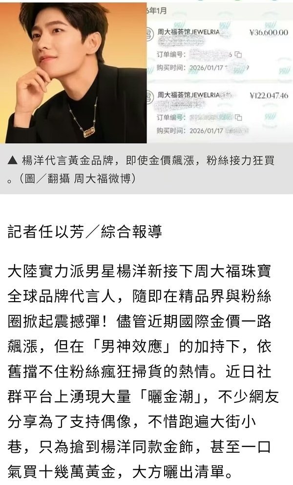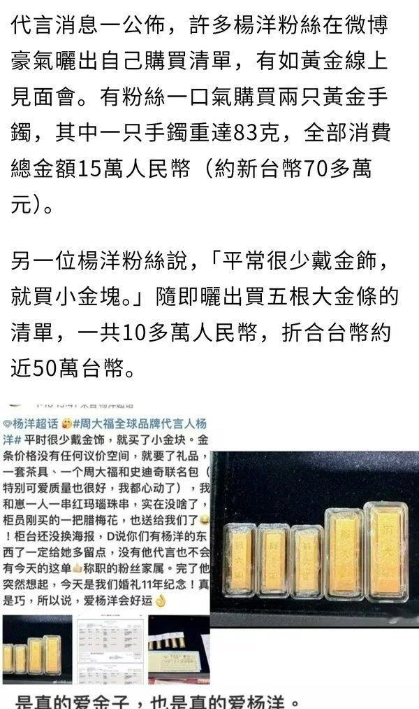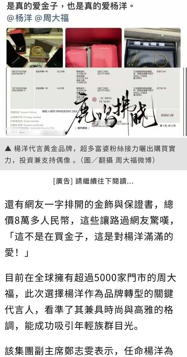 杨洋粉丝太有钱了,周大福晒单晒了三天还没完,还上了新闻😂很多剧粉和漫粉也买了,杨洋太勾人了